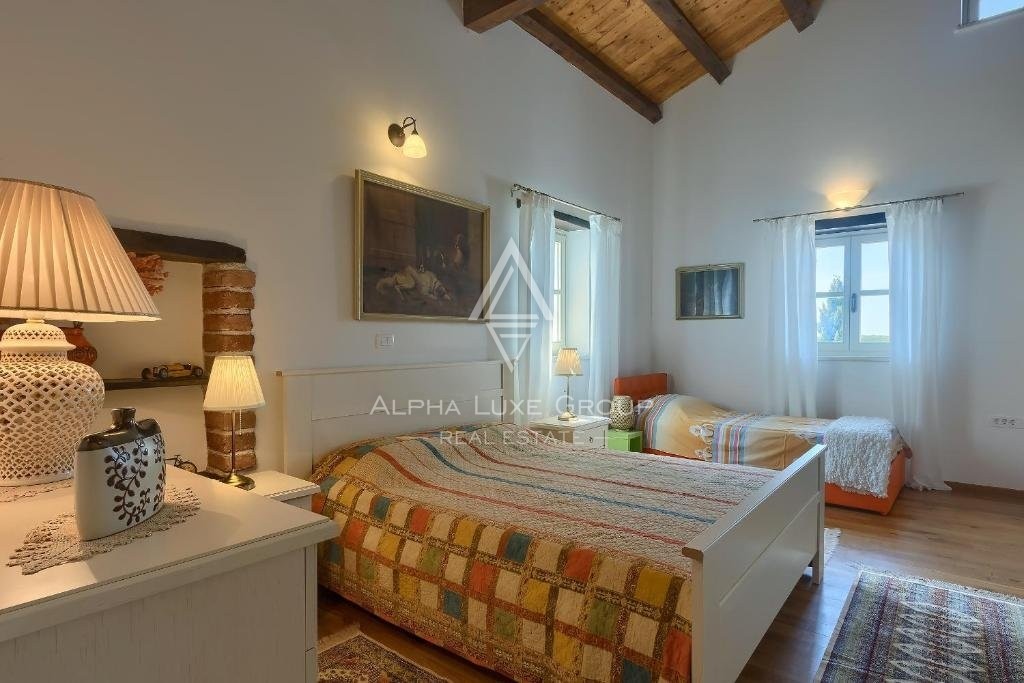 Piano Superiore: Una scala in terracotta e legno conduce al primo piano, che vanta pavimenti in parquet di legno e un balcone con sedute per godere della vista mozzafiato sul paesaggio istriano. La camera da letto principale include armadi in legno massiccio, un grande letto matrimoniale e un bagno interno con vasca, doccia, bidet e doppio lavandino. Altre due camere da letto dispongono ciascuna di un letto matrimoniale, un altro letto singolo e bagni completi.