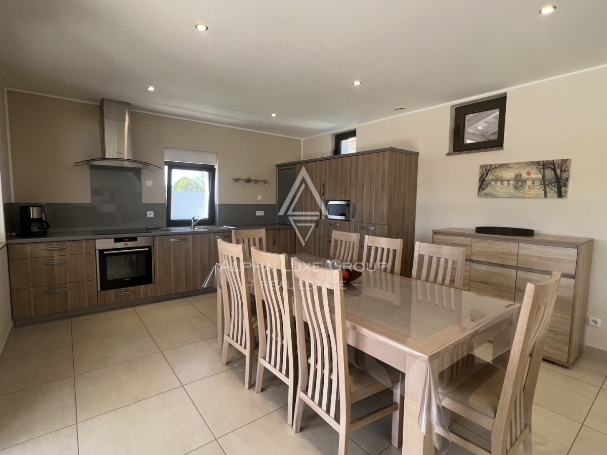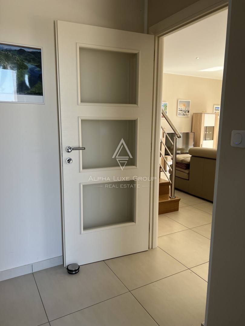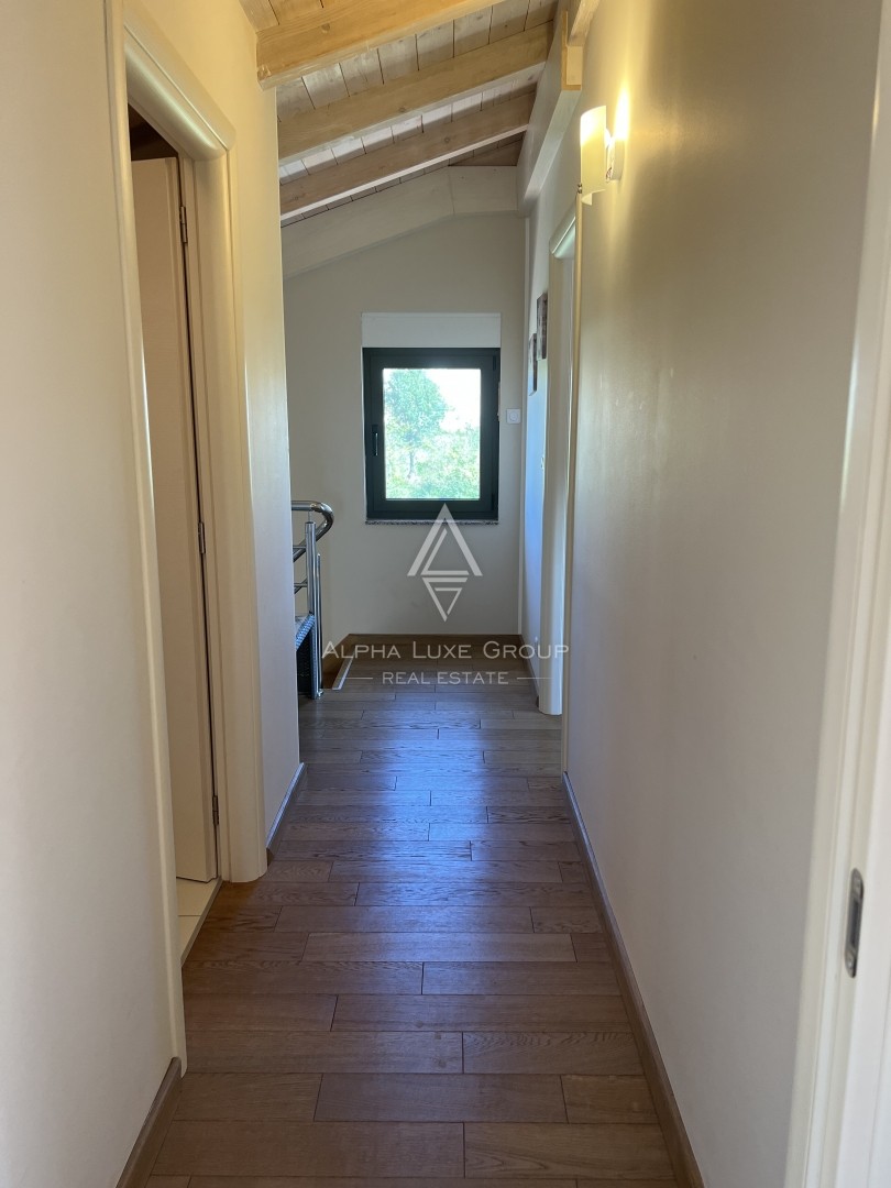 La casa offre circa 186 m² di superficie abitabile su un terreno paesaggisticamente curato di circa 560 m², garantendo ampi spazi interni e piacevoli aree esterne. La disposizione comprende quattro spaziose camere da letto con letti di qualità, un luminoso soggiorno ricco di luce naturale, una cucina completamente attrezzata adatta alla vita quotidiana o all’accoglienza degli ospiti e due bagni moderni con doccia e vasca. Un balcone al piano superiore regala una vista panoramica aperta sul paesaggio naturale circostante, creando un’oasi privata di relax.