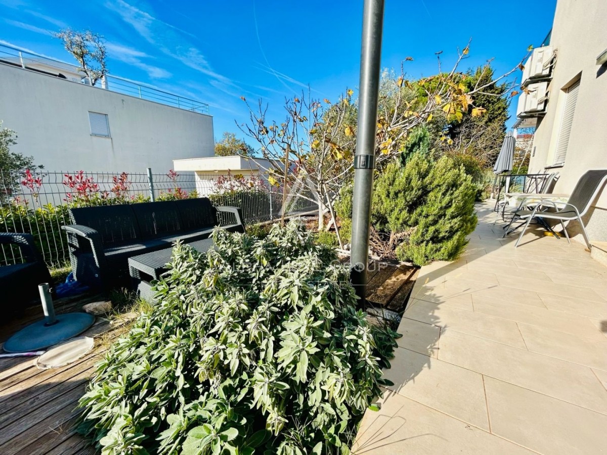La disposizione interna comprende un ingresso, una cucina moderna con zona pranzo e soggiorno a pianta aperta, due camere da letto e un bagno. Il soggiorno, orientato a sud-ovest, è luminoso e si collega a un giardino privato di 180 m², abbellito con piante, ulivi e uno spazio per il relax all’aperto.