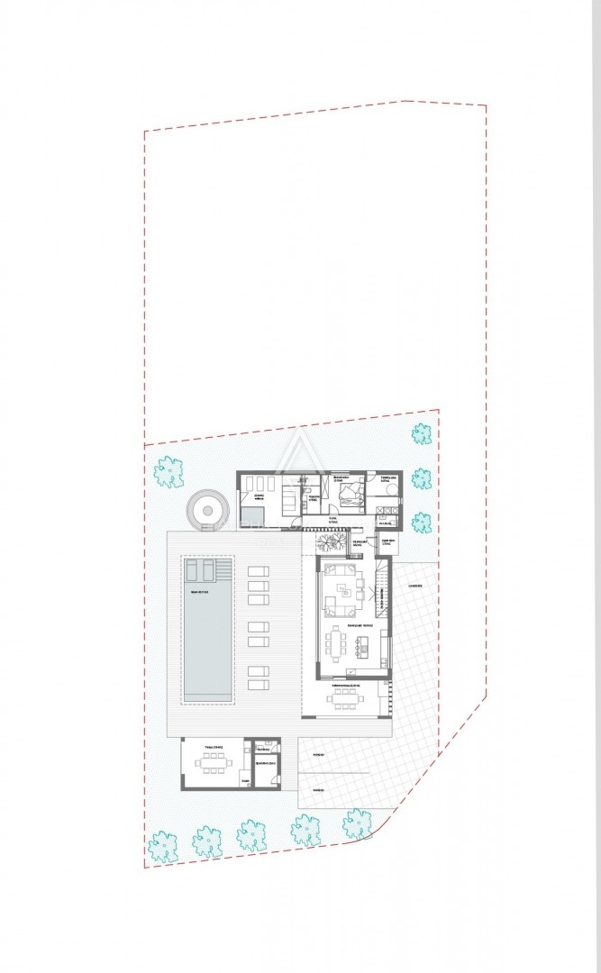 Il piano terra dispone di un atrio d'ingresso, un bagno per ospiti, e un ampio soggiorno con cucina a vista che si estende per 55,85m², conducente a una terrazza coperta di 22m² che offre viste serene sulla foresta circostante. Questo livello ospita anche una suite da letto con il proprio bagno, un'area benessere completa di jacuzzi e sauna, e un accesso diretto a un caminetto esterno, perfetto per serate accoglienti. Una piscina di 48m² e un'ampia area esterna arricchiscono l'esperienza di vita all'aperto.