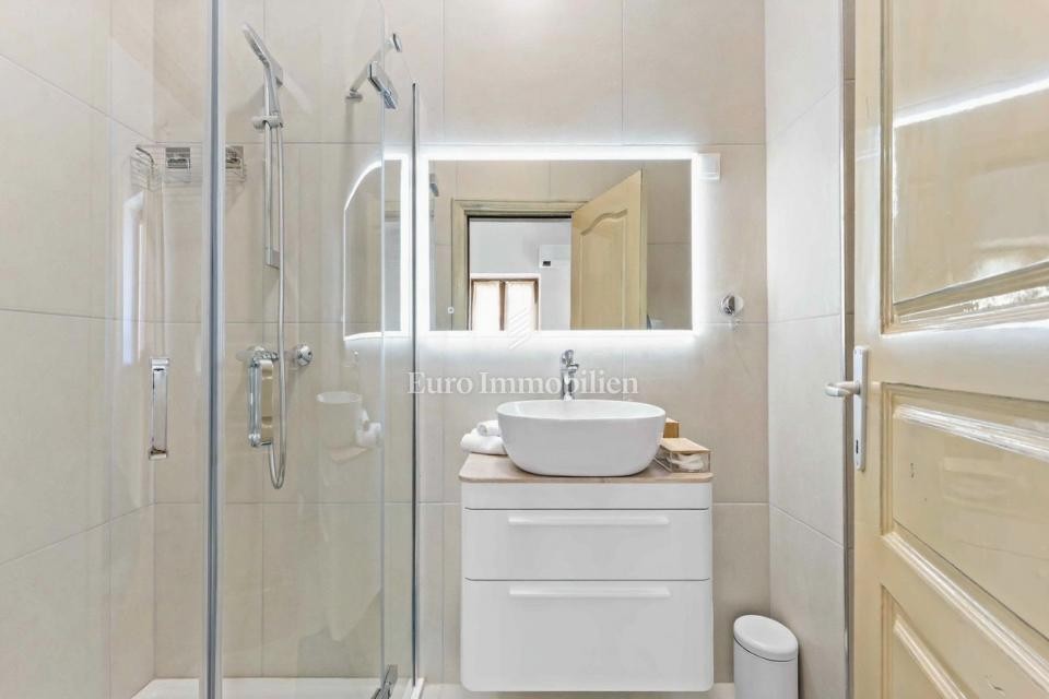 Il terreno recintato di 512 m² è completamente sistemato e ospita una piscina riscaldata di 32 m² con solarium pavimentato, ideale per prendere il sole e rilassarsi. Il giardino garantisce privacy e tranquillità, ed è dotato anche di un barbecue esterno, ideale per cucinare all’aperto.