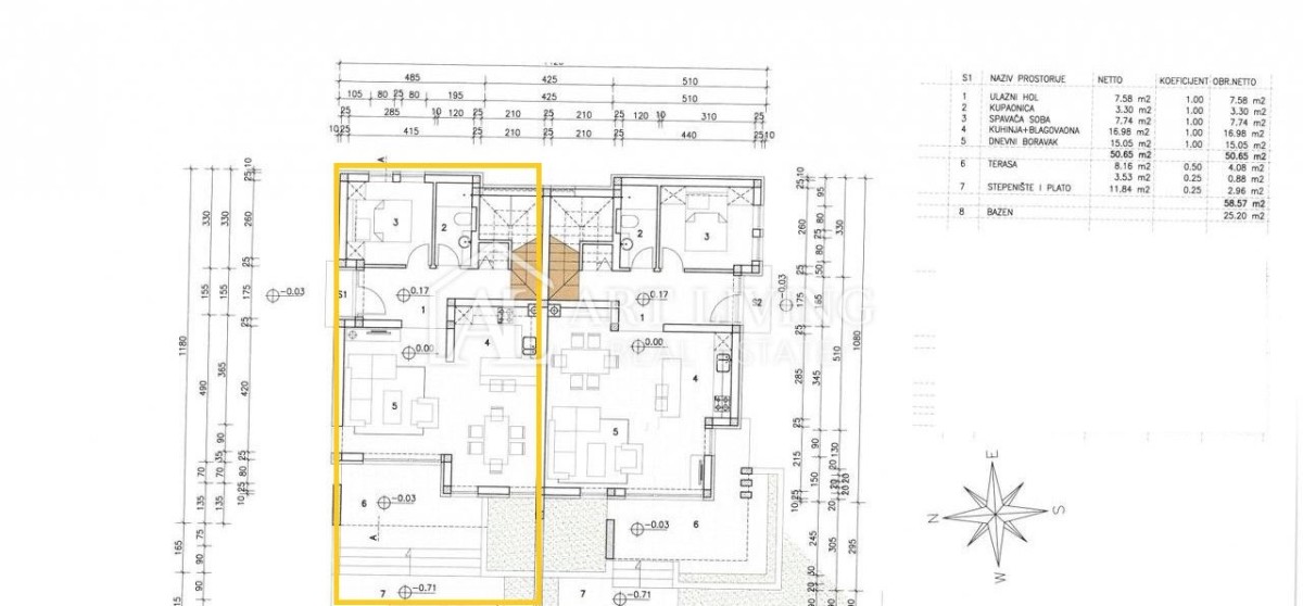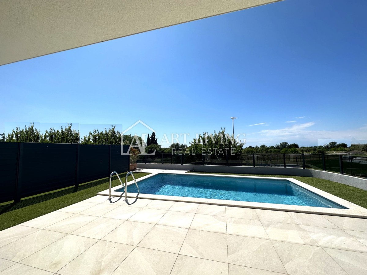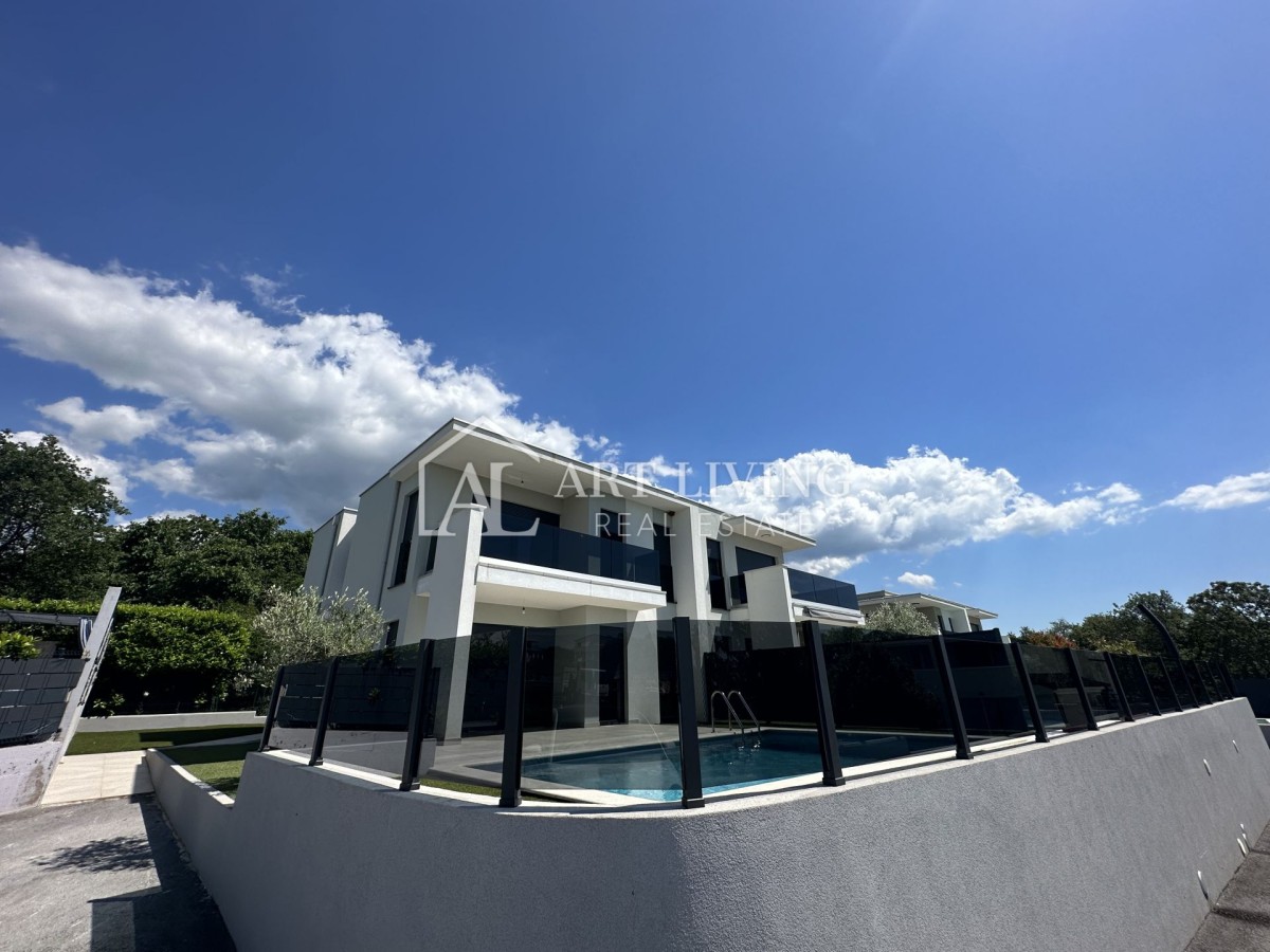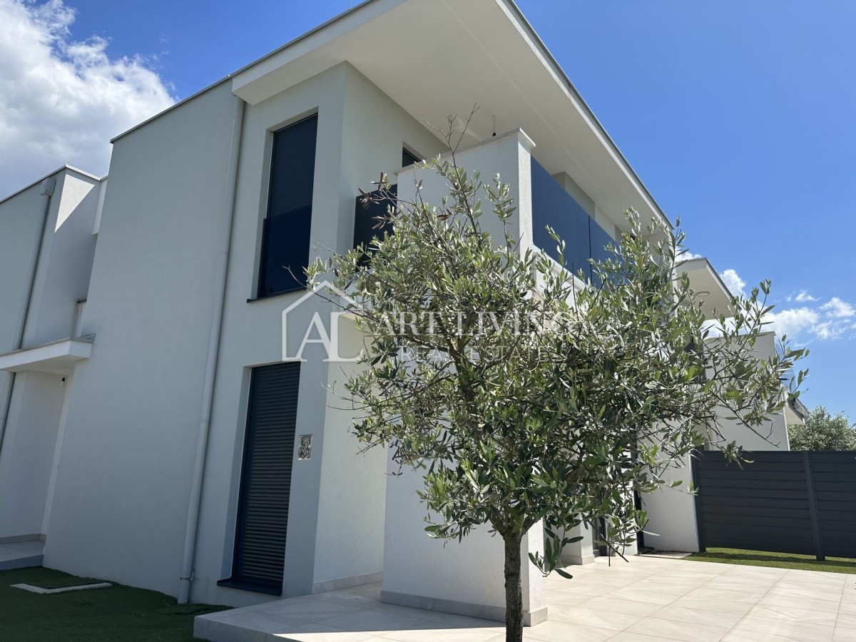 In vendita villa bifamiliare con piscina, di nuova costruzione e architettura moderna, situata in una zona tranquilla e bella, a pochi minuti di auto dalla vicina Lovrečica e a soli 1,3 km dal mare.