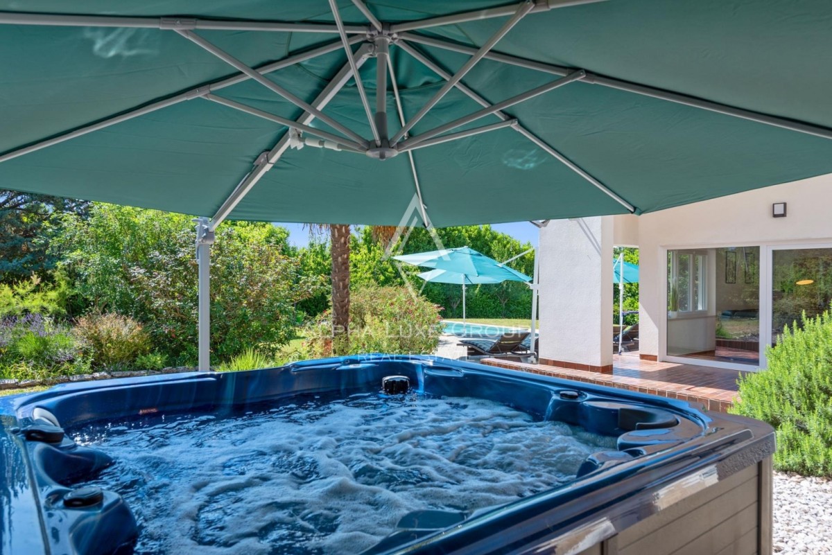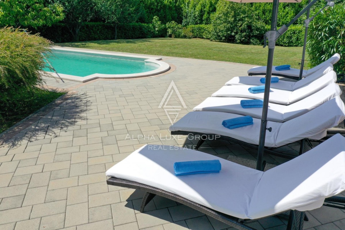 Questa lussuosa villa si estende su 300 m² distribuiti su due livelli, oltre a un'ulteriore dependance, ed è circondata da giardini ben curati. L'area giorno principale al piano terra presenta soffitti alti e un layout open-concept che combina salotto, sala da pranzo e cucina in un ambiente coeso e sociale. Grandi porte a vetro conducono a un'ampia terrazza che include una piscina e un rigoglioso giardino. Il piano terra dispone anche di due camere da letto, ciascuna con bagno en-suite; una delle camere offre accesso privato a una terrazza attrezzata con vasca idromassaggio.