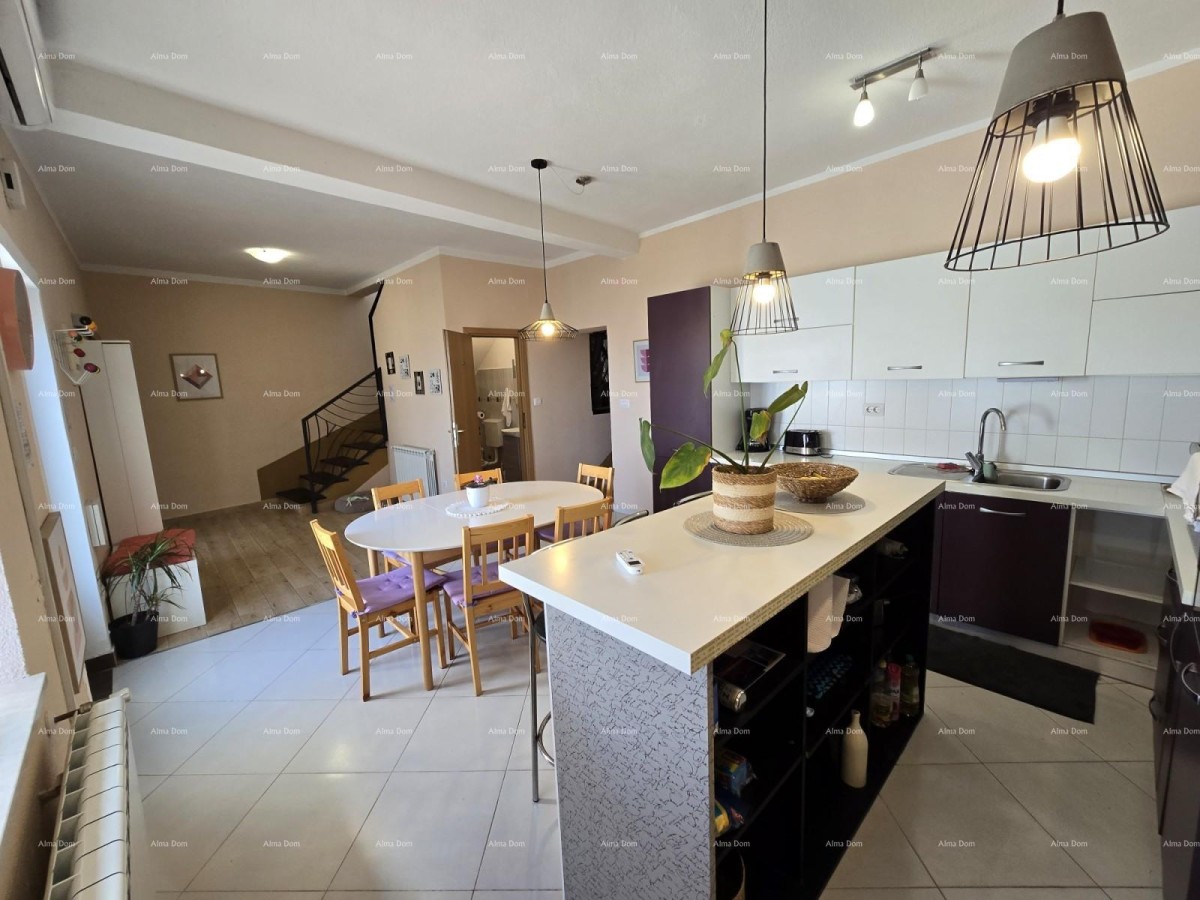 Le scale interne portano al mezzanino della casa, dove si trova un ampio soggiorno con una terrazza di circa 8 m². Altre scale interne conducono al primo piano, dove si trovano due camere da letto e un bagno.