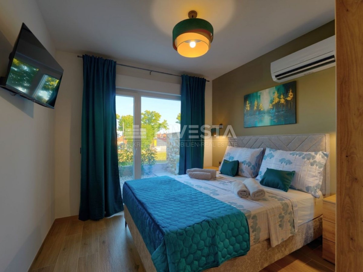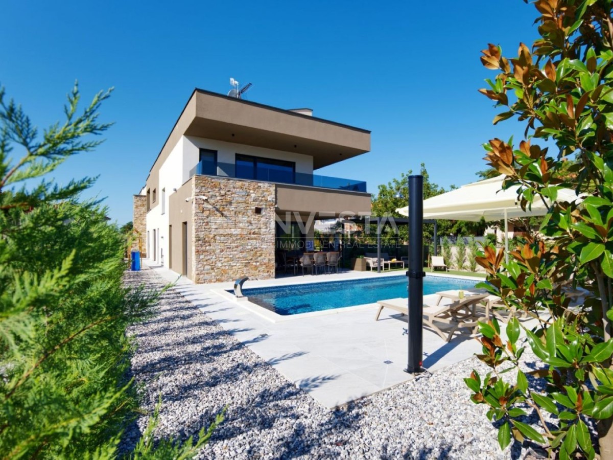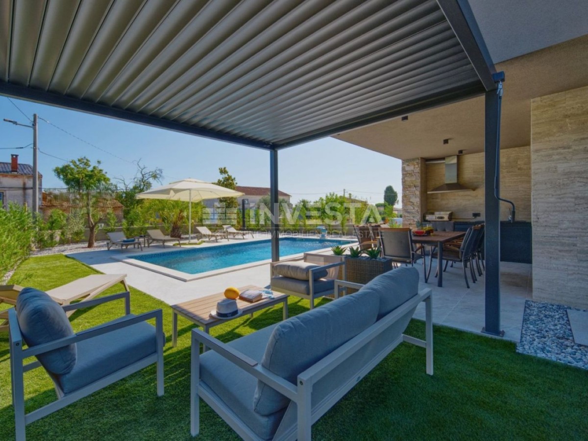 Nel tranquillo paese di Marcana, vicino a Pola e al mare, è in vendita una nuova villa bifamiliare, moderna, costruita nel 2024.