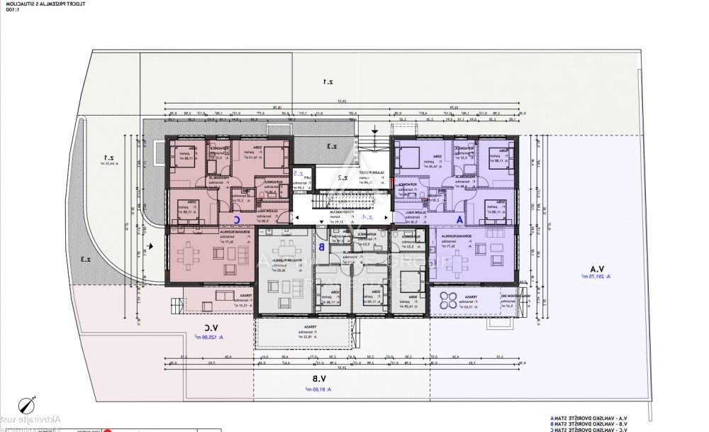 Il suddetto fabbricato dispone in vendita di un appartamento della superficie abitabile di 182 mq posto al primo piano, di due piedi e collegato da scala interna. Inoltre, ci sono due posti auto disponibili nel garage sotterraneo e un deposito nel seminterrato che lo accompagna.