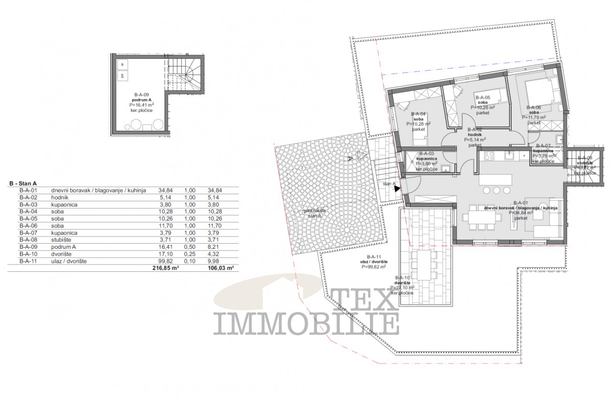 Questo ampio appartamento, con una superficie netta di 91,73 m², presenta una disposizione ben pensata, comprensiva di un ampio soggiorno con cucina e zona pranzo, tre comode camere da letto e due bagni. Il cortile associato con una superficie di 116,92 m², un seminterrato di 16,41 m² e due posti auto lo rendono ulteriormente adatto per una vita confortevole. Per il vostro comfort, l'appartamento sarà dotato di riscaldamento a pavimento e di un condizionatore d'aria inverter per un riscaldamento e raffreddamento ottimali durante tutto l'anno. Un'ottima opportunità per la vostra nuova casa o per affitti turistici!