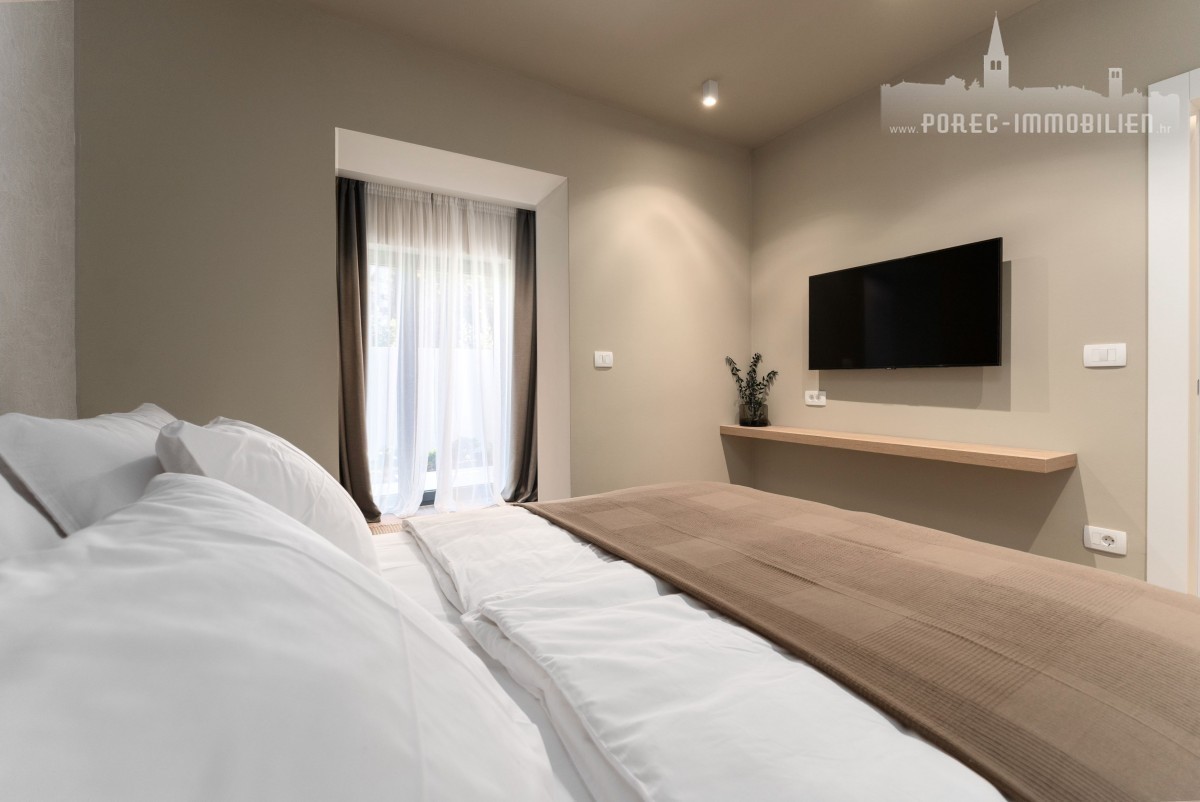 Vendesi la bellissima villa recentemente ristrutturata con la superficie totale di 683 metri quadrati, situata a solo 1 chilometro dalle splendide spiagge di Parenzo. Questa villa è divisa in tre appartamenti separati distribuiti su due piani. Ogni appartamento dispone di piano terra con una camera da letto e il bagno, la cucina con la zona pranzo e il soggiorno con l'ampio terrazzo di 35 metri quadrati. La terrazza è attrezzata con gli mobili da giardino per il relax e la cucina estiva.