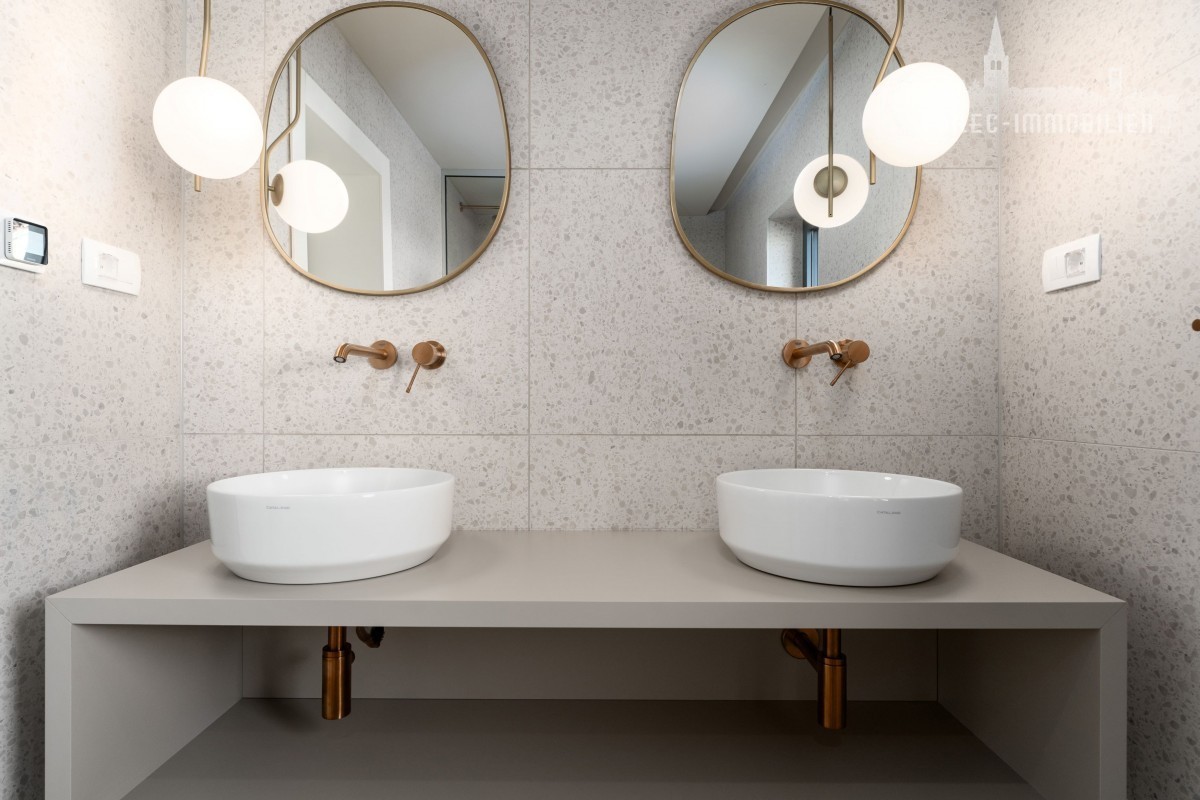 Inoltre ogni appartamento ha la sua scala interna che porta al primo piano dove si trovano altre due camere da letto di generose dimensioni, ciascuna con il bagno e il terrazzo privato che offre la splendida vista sul mare.