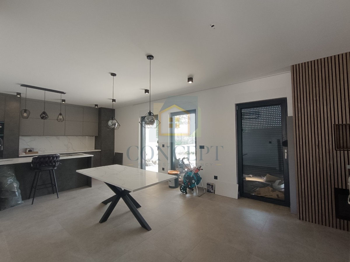 In una zona tranquilla nei dintorni di Poreč, ai margini della zona edificabile, è in vendita una nuova villa unifamiliare con piscina e vista aperta sulla natura circostante. La proprietà si trova a 4,5 km da Baderna e a 17 km dal mare e dal centro di Poreč.