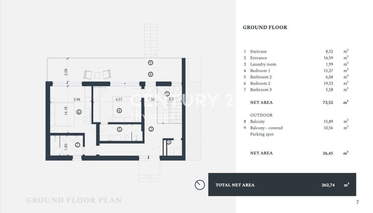 La casa ha una superficie di 262 mq, si trova su un lotto di terreno di 198 mq, e si estende su 3 piani.