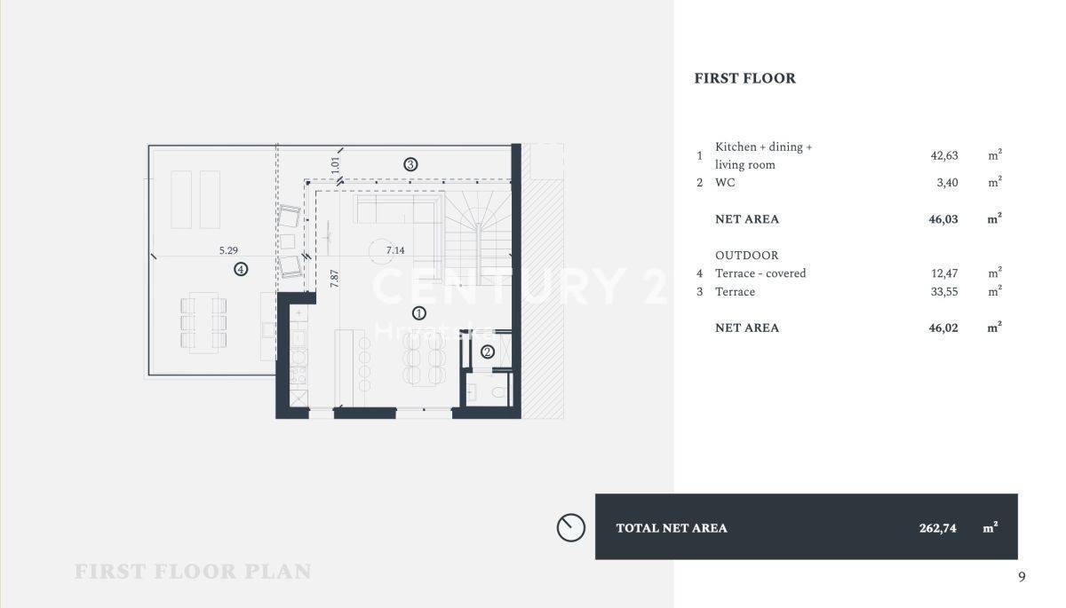 Il piano terra è composto da due camere da letto con bagno privato e accesso al balcone e un ripostiglio, mentre il primo piano è composto da un ampio soggiorno con accesso ad un terrazzo parzialmente coperto di 46 mq, una cucina con sala da pranzo e un ulteriore toilette.