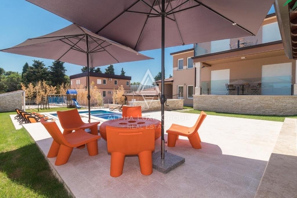 L'ampio giardino offre ampio parcheggio per sei-sette veicoli, una spaziosa piscina, una cucina estiva, un parco giochi per bambini e un campo sportivo multifunzionale, rendendo questa casa l'ambiente ideale per la vita familiare e il relax attivo.