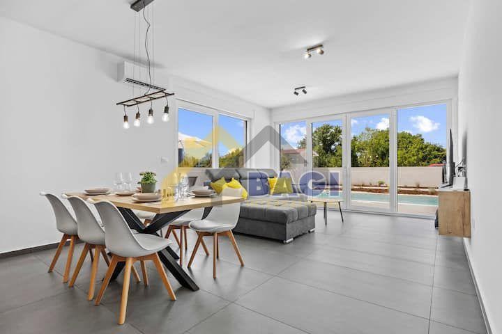 In vendita una moderna villa di nuova costruzione a Štokovci, Svetvinčenat. L'interno della villa è composto da un soggiorno con zona pranzo e cucina, tre ampie camere da letto con bagno e un bagno per gli ospiti, per una superficie totale di 139 m². Il piano terra è arredato in stile moderno, con un'altezza del soffitto di 2,7 metri e alte pareti scorrevoli, che garantiscono la massima luminosità durante tutto il giorno. La casa è dotata di riscaldamento a pavimento e aria condizionata. Il terreno di 683 m² ospita una piscina riscaldata di 12 metri, aree dedicate al nuoto, casette da giardino, posti auto con caricabatterie elettrico, orticoltura e irrigazione automatica, e una terrazza pavimentata per il relax.
