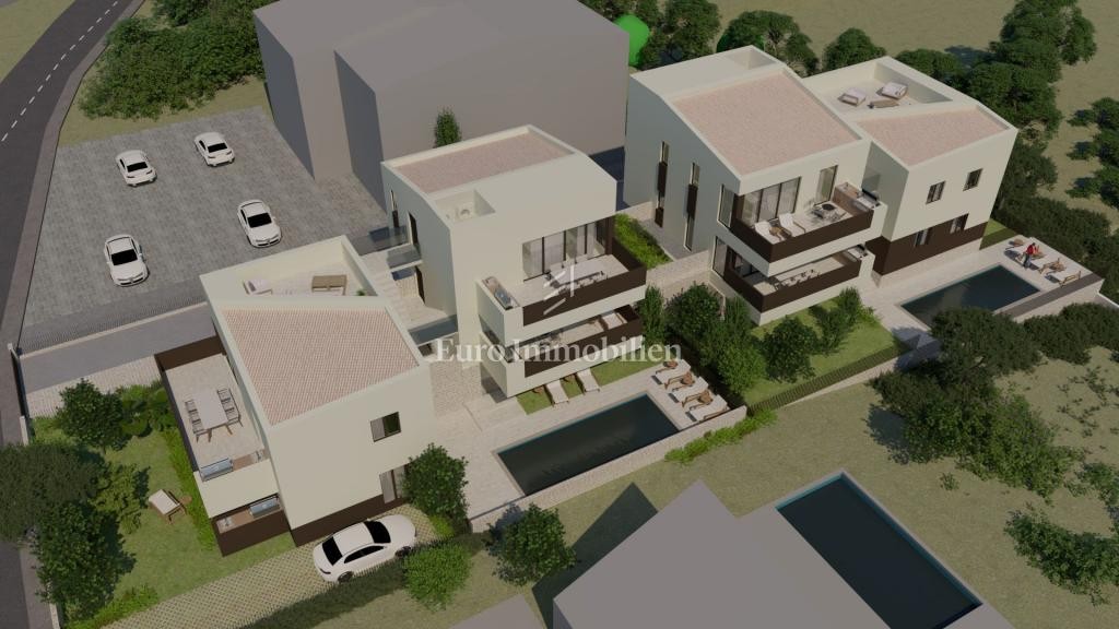Il terreno edificabile di 1239 m² in vendita è suddiviso in due parti, al fine di soddisfare il criterio di 4 appartamenti per lotto. È disponibile uno studio geodetico della parcellizzazione con certificato catastale attestante l'avvenuta parcellizzazione e la definizione del terreno. Non vi sono vincoli e i lavori possono iniziare immediatamente. I proprietari hanno due progetti principali con due permessi di costruire e tutte le utenze sono state pagate: l'elettricità è sul lotto, l'acqua è disponibile di fronte al lotto, così come la rete fognaria, le telecomunicazioni sono adiacenti al lotto. I lavori possono iniziare immediatamente. Il progetto comprende 8 appartamenti, due posti auto per appartamento, due piscine e due garage con due posti auto ciascuno.