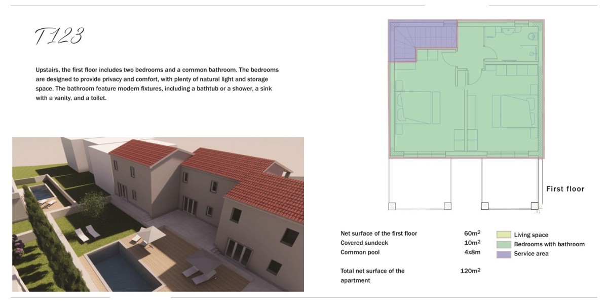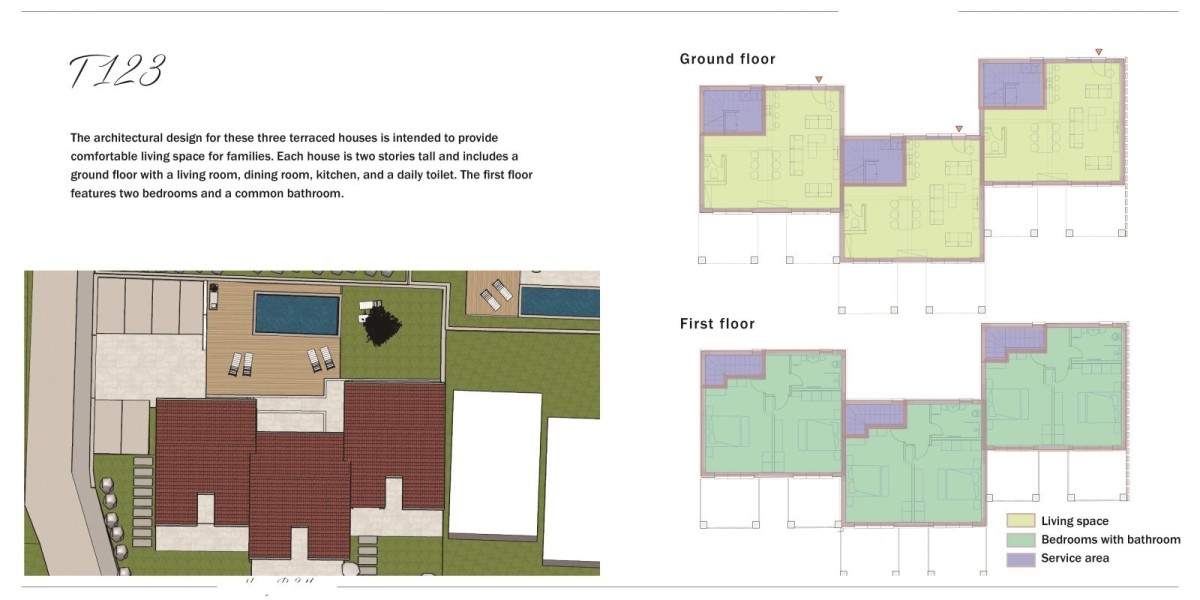 Nell'idilliaco ambiente di Verteneglio è disponibile un terreno edificabile di 1130 m2, l'ultimo del suo genere in questa zona. Sul terreno è già stato definito un progetto per la costruzione di tre case a schiera con piscina, ciascuna con una superficie di 120 m2. Sono già stati ottenuti tutti i permessi edilizi necessari, comprese le spese per le utenze.
