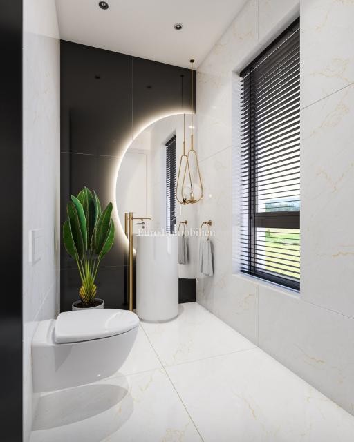 Le grandi vetrate garantiscono abbondante luce naturale, illuminando ogni angolo dell’ambiente. Parte del tetto è in vetro (per tutta la lunghezza delle scale sinistra e destra). Il riscaldamento e il raffrescamento sono assicurati da riscaldamento e raffrescamento a pavimento tramite pompa di calore e ventilconvettori. Tra le dotazioni spiccano serramenti in alluminio, persiane con sensori e comando a distanza, ampia porta d’ingresso smart pivot, telecamere integrate e sistema di allarme.