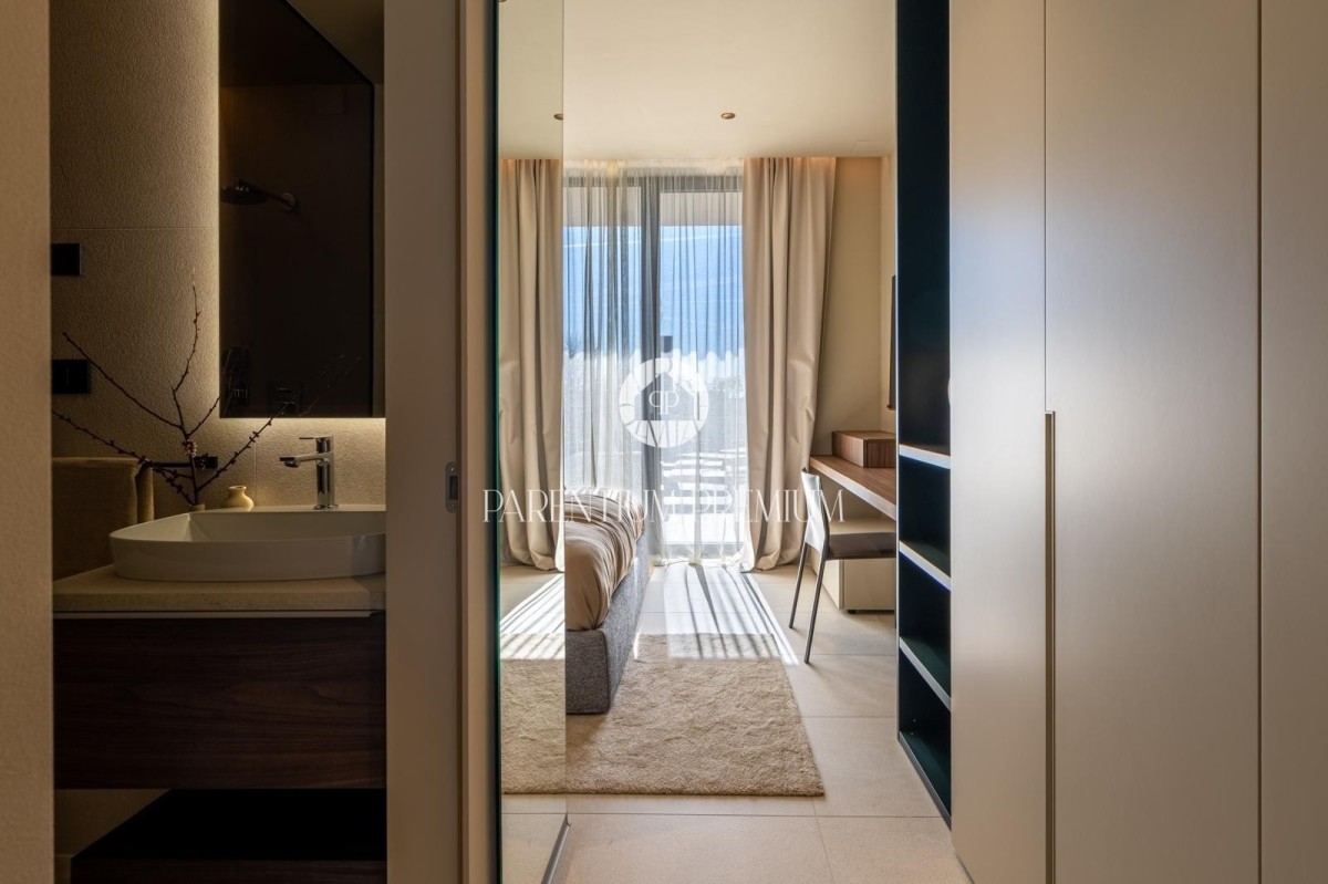 Gli interni sono valorizzati da soffitti alti 280 cm e serramenti in alluminio WICONA con finestre e porte a tutta altezza, che assicurano grande luminosità, ariosità e viste aperte. Il doppio sistema di tende – tende filtranti e tende oscuranti – consente il massimo controllo della luce e della privacy in ogni ambiente.