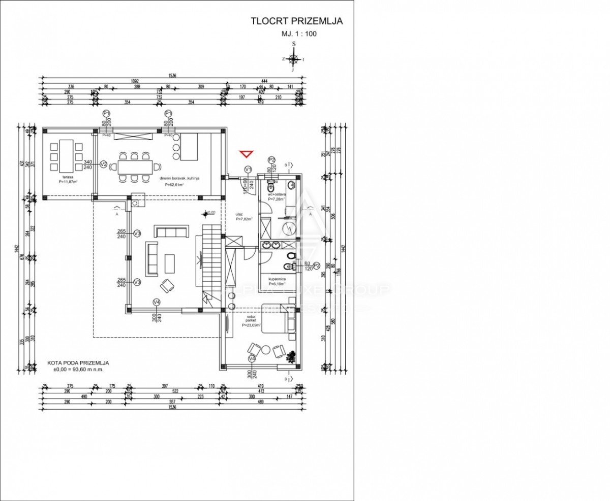 Al piano terra si trovano un grande soggiorno, un'ampia cucina e sala da pranzo, una camera da letto con pareti in vetro, un bagno, una dispensa e una toilette. La terrazza è accessibile dal soggiorno e la piscina è accessibile da lì.
