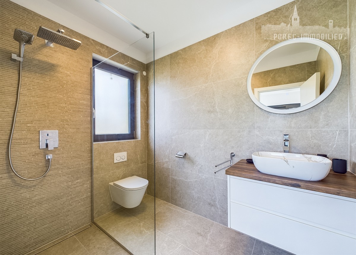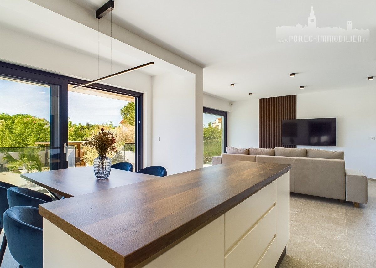 Vendesi la villa moderna situata a Parenzo, a soli 2 km dal mare. La proprietà offre la superficie netta di 217,43 m2 e dispone di una vista mozzafiato sui rigogliosi dintorni. Si compone di seminterrato, piano terra e primo piano e si trova su un terreno di 707 mq.