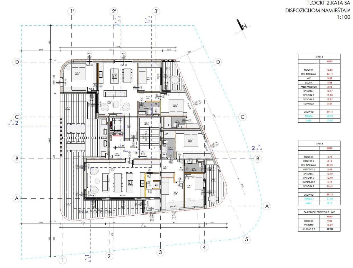 Appartement 6, oppervlakte 103,79 m2, bevindt zich op de 2e verdieping van het gebouw en bestaat uit een hal, keuken en woonkamer, 3 slaapkamers, 2 badkamers. Het appartement beschikt over een loggia van 8,10 m2 en een terras van 27,28 m2 en uitzicht op zee.