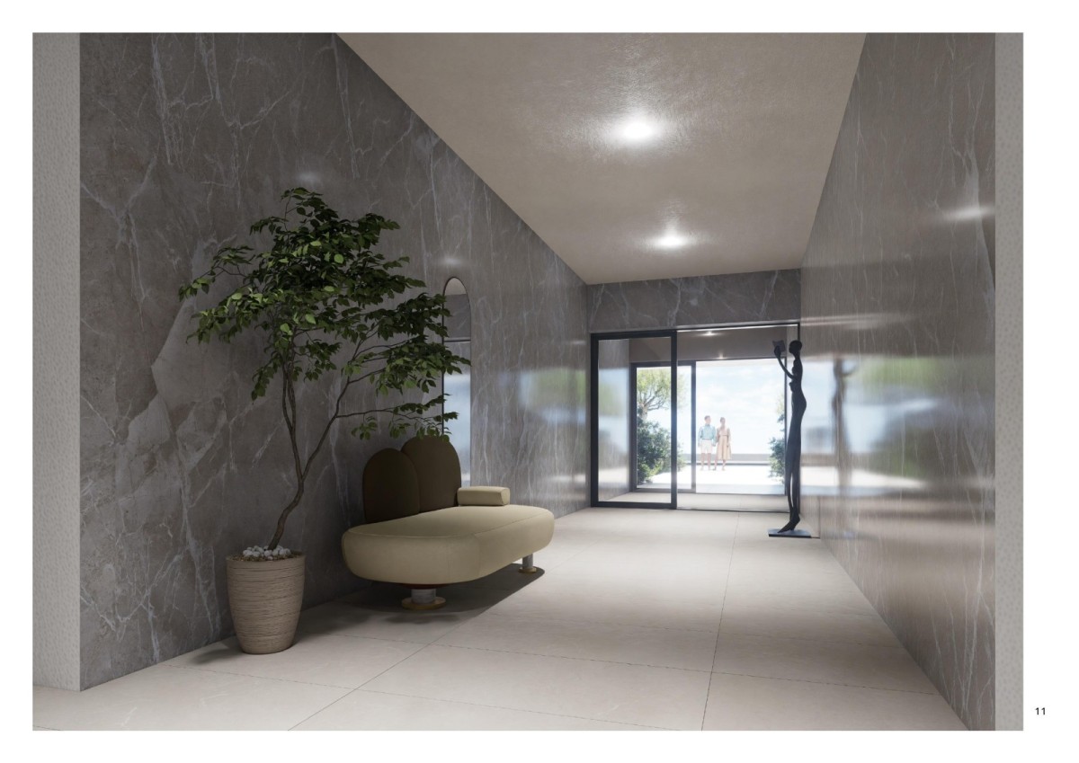 Stanovanje je zasnovano tako, da obsega predsobo, kopalnico, spalnico, kuhinjo in dnevno sobo. Dnevna soba se odpira na pokrito teraso. V ceno stanovanja je vključena tudi letna kuhinja na terasi.
