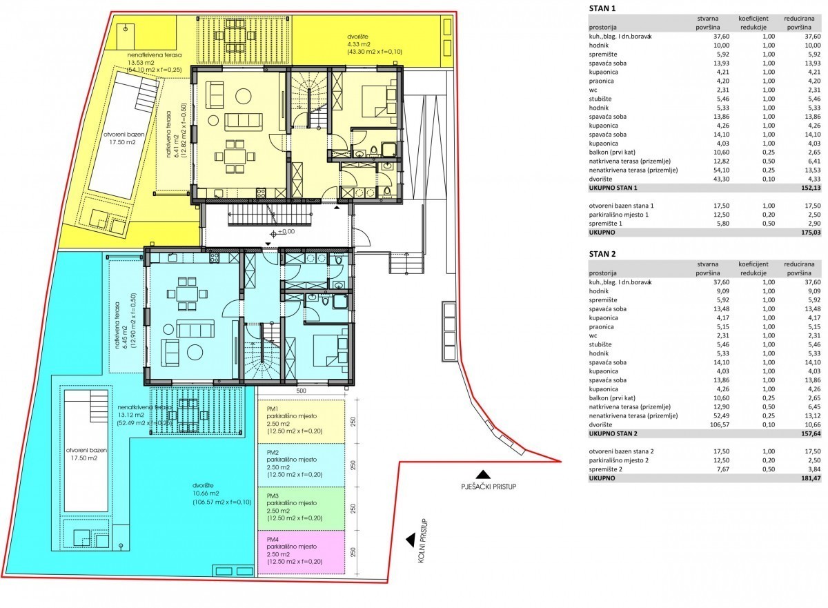 Stanovanje s površino 152,13 m2 se razteza v dveh etažah: pritličje in nadstropje. V pritličju je hodnik, prostorna dnevna soba z odprto kuhinjo in jedilnico, ena spalnica, kopalnica in wc. Iz dnevne sobe je direkten dostop na lepo pokrito teraso 12,82 m2 in nepokrito teraso 54 m2 ter bazen na dvorišču 17,50 m2. Prvo nadstropje je dostopno po notranjih stopnicah. V prvem nadstropju sta še dve spalnici, vsaka s svojo kopalnico in izhodom na 10,60 m2 velik balkon. Stanovanju pripada tudi parkirno mesto in shramba v kleti.