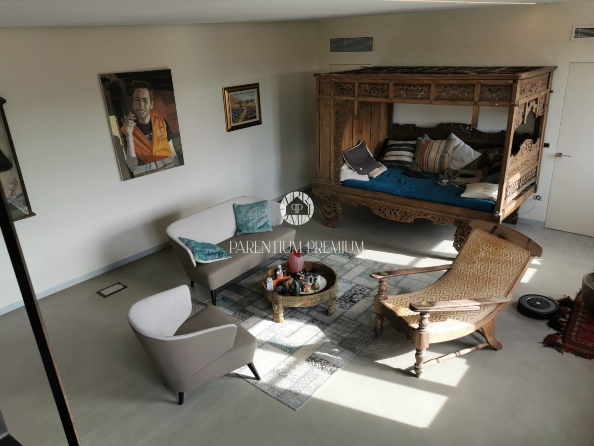 Zgornja etaža: glavna spalnica z lastno kopalnico in izhodom na strešno teraso 30 m² s panoramskim pogledom na morje