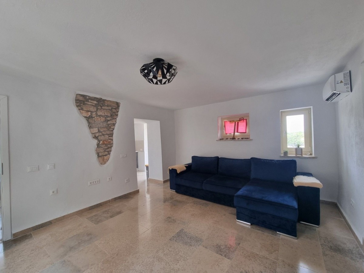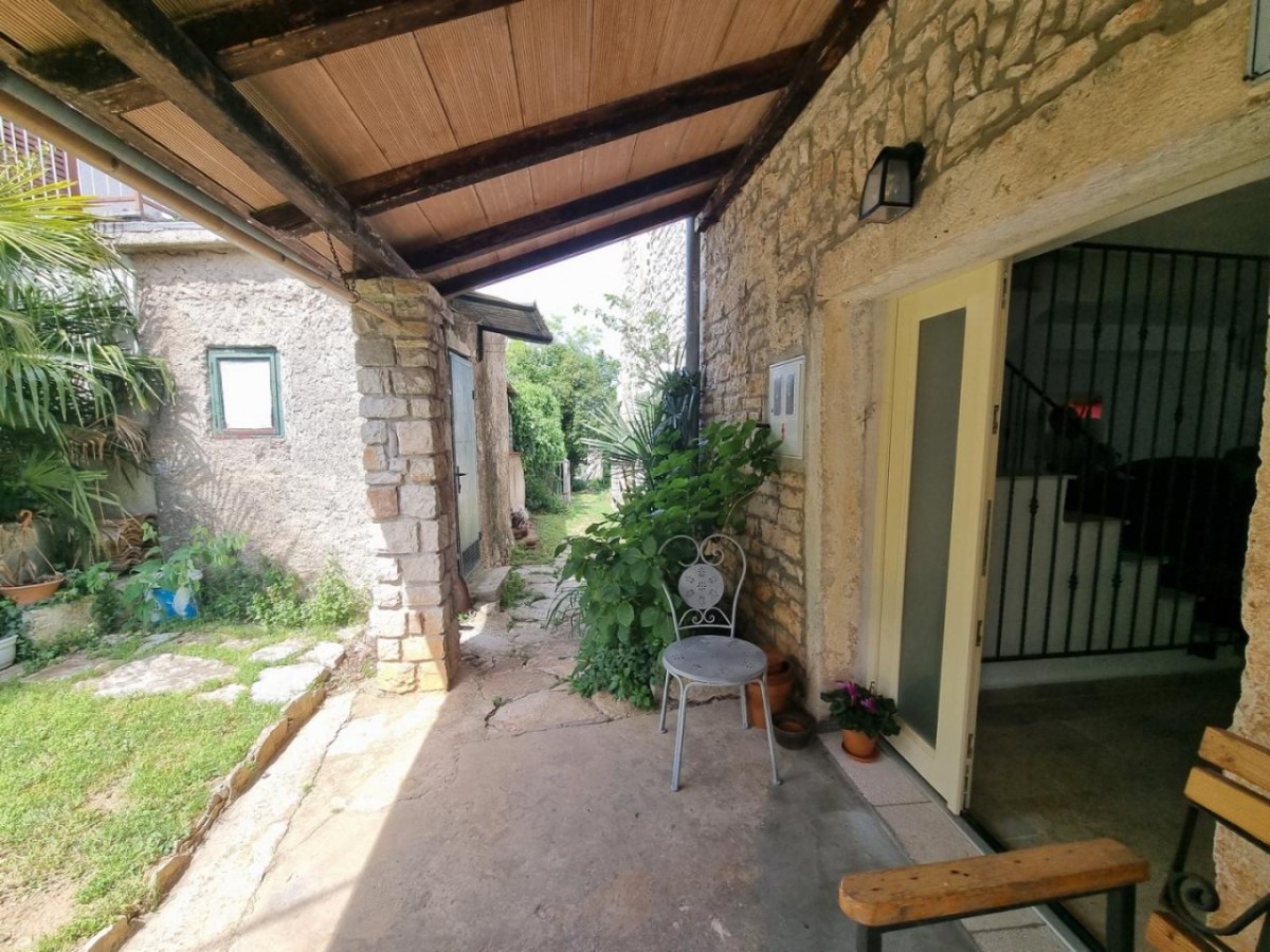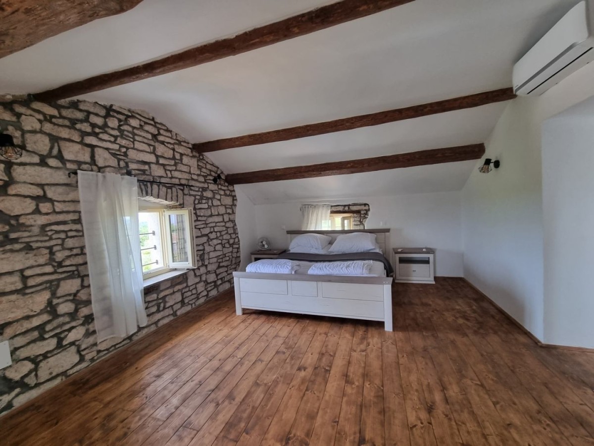 Ta očarljiva kamnita lepotica se nahaja v središču majhnega istrskega mesteca, v neposredni bližini vseh ugodnosti, le 3 km od urejenih plaž. Hiša ni samostojna, ampak je z drugo hišo povezana le na eni strani. Hiša je bila zgrajena pred letom 1968 in je bila leta 2022 obnovljena ter opremljena s pohištvom in opremo. Na vrtu je bazen, zunanji žar in parkirna mesta. Sestavljena je iz treh nadstropij: pritličja, prvega nadstropja in visokega podstrešja. V pritličju so jedilnica, kuhinja, velika dnevna soba s kamnitimi oblogami in kopalnica. Notranje stopnice vodijo v prvo nadstropje, kjer sta dve spalnici (ena večja in ena manjša) ter kopalnica. Večja soba vodi na prostoren balkon z odprtim pogledom na morje in naravo, z vrtom pa je povezana z zunanjimi stopnicami. V visokem podstrešju sta še dve spalnici (ena večja in ena manjša, brez terase) in kopalnica. Ogrevanje/hlajenje je regulirano s klimatsko napravo, dnevna soba pa ima kamin za zimsko vzdušje. Hiša se prodaja s pohištvom in opremo!