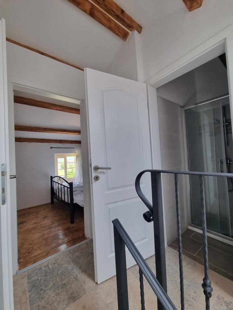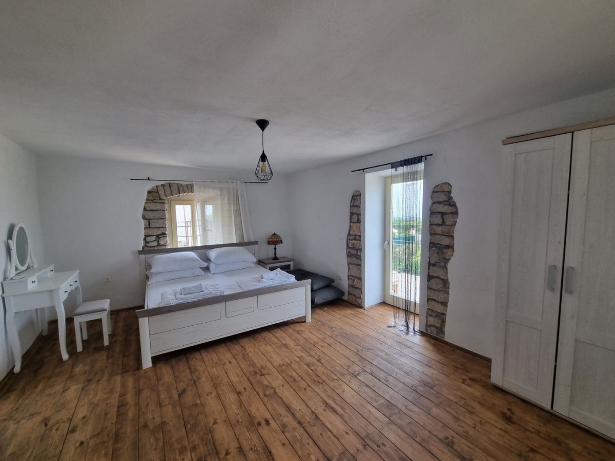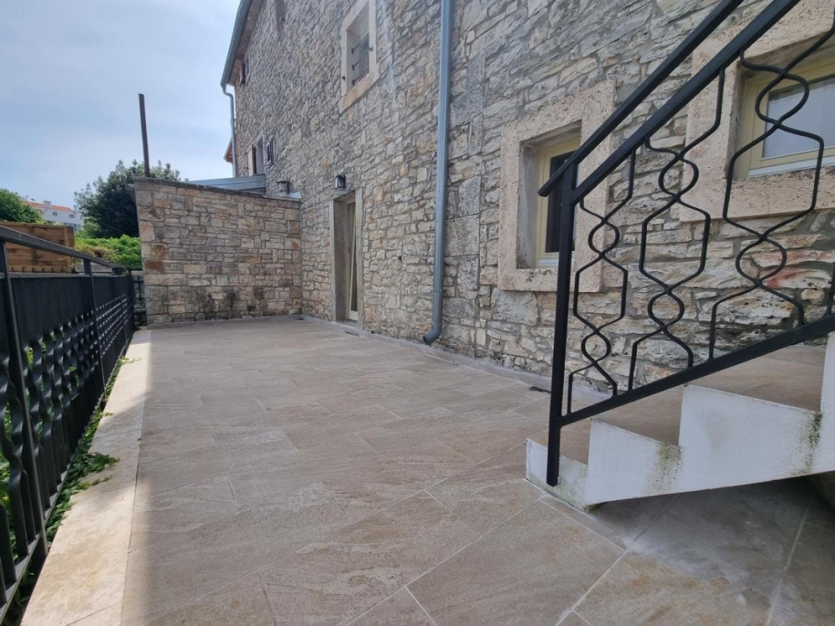 Ta očarljiva kamnita lepotica se nahaja v središču majhnega istrskega mesteca, v neposredni bližini vseh ugodnosti, le 3 km od urejenih plaž. Hiša ni samostojna, ampak je z drugo hišo povezana le na eni strani. Hiša je bila zgrajena pred letom 1968 in je bila leta 2022 obnovljena ter opremljena s pohištvom in opremo. Na vrtu je bazen, zunanji žar in parkirna mesta. Sestavljena je iz treh nadstropij: pritličja, prvega nadstropja in visokega podstrešja. V pritličju so jedilnica, kuhinja, velika dnevna soba s kamnitimi oblogami in kopalnica. Notranje stopnice vodijo v prvo nadstropje, kjer sta dve spalnici (ena večja in ena manjša) ter kopalnica. Večja soba vodi na prostoren balkon z odprtim pogledom na morje in naravo, z vrtom pa je povezana z zunanjimi stopnicami. V visokem podstrešju sta še dve spalnici (ena večja in ena manjša, brez terase) in kopalnica. Ogrevanje/hlajenje je regulirano s klimatsko napravo, dnevna soba pa ima kamin za zimsko vzdušje. Hiša se prodaja s pohištvom in opremo!