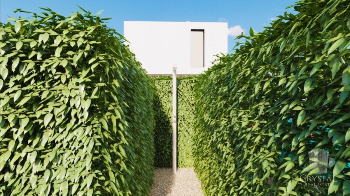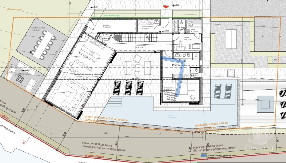 Naprodaj je parcela s projektom in gradbenim dovoljenjem za samostojno vilo z bazenom na mirni lokaciji s pogledom na morje. Vila ima notranjo površino 274 m2 in se razteza čez pritličje in 1. nadstropje. Pritličje sestavljajo vhodna dvorana, pralnica, shramba, stranišče, savna in fitnes, spalnica s kopalnico ter velika dnevna soba, povezana s kuhinjo in jedilnico. Iz dnevne sobe je izhod skozi velika drsna vrata na vrt s prostorno pokrito teraso velikosti 32,86 m2 in bazenom velikosti 66 m2. V 1. nadstropju so 3 spalnice, vsaka s svojo kopalnico in teraso. Ta čudovita in avtohtona vila ima velik potencial in se lahko uporablja za stanovanjske ali turistične namene.