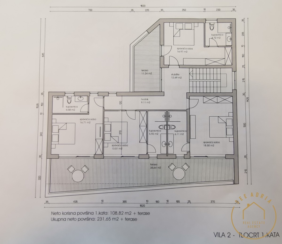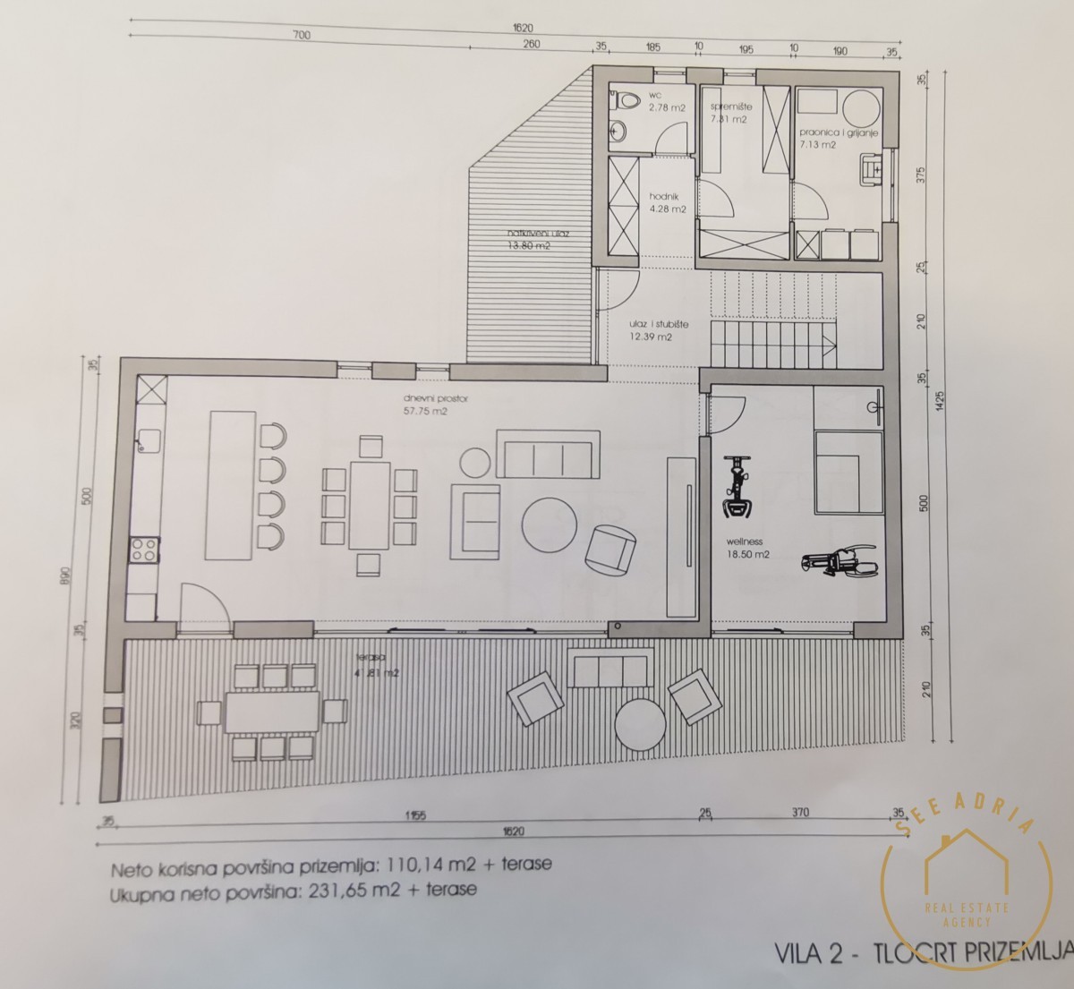 Lepa moderna vila v 2 etažah v okolici Poreča je naprodaj. Pritličje obsega prostorno dnevno sobo, kuhinjo in jedilnico v "open space" izvedbi do 57 m2, wellness kotiček za uživanje, tehnični prostor, pralnico in WC za goste. V prvem nadstropju so štiri spalnice z lastno kopalnico, vsaka s svojo kopalnico in teraso 36 m2.