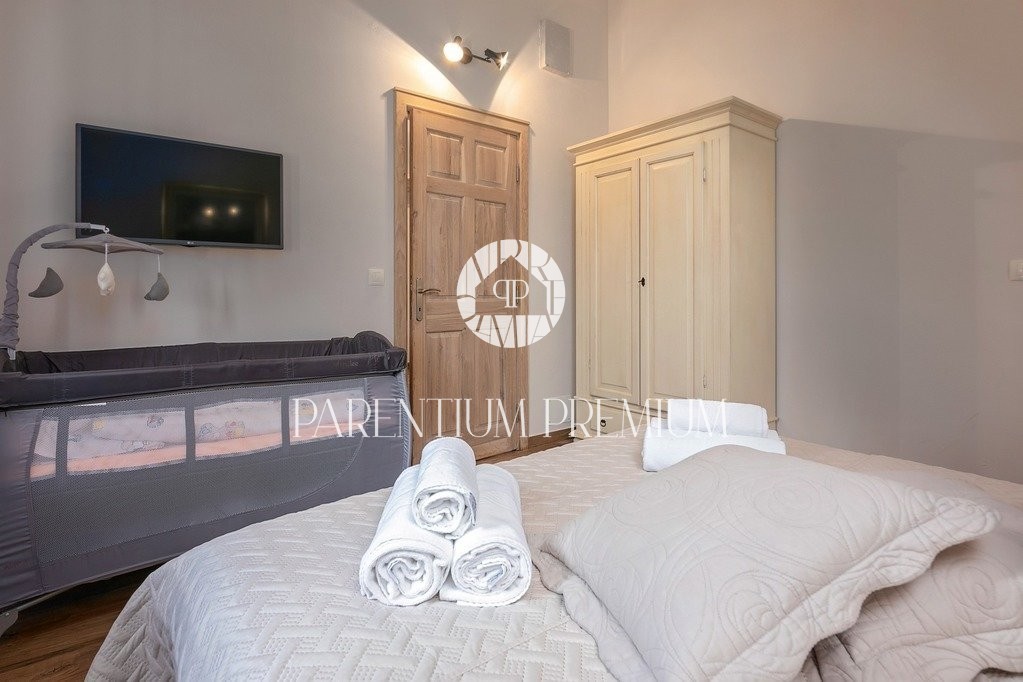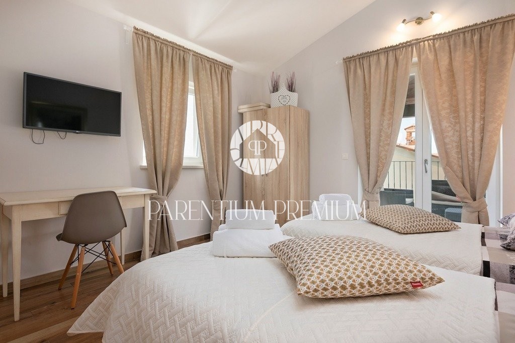 Ta dizajnerska vila velikosti 355m2 s parcelo 562m2 je zgrajena v istrskem slogu in se nahaja v majhnem, mirnem kraju v bližini mesta Poreč.