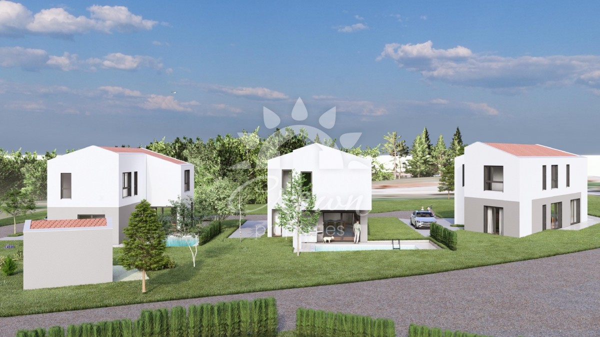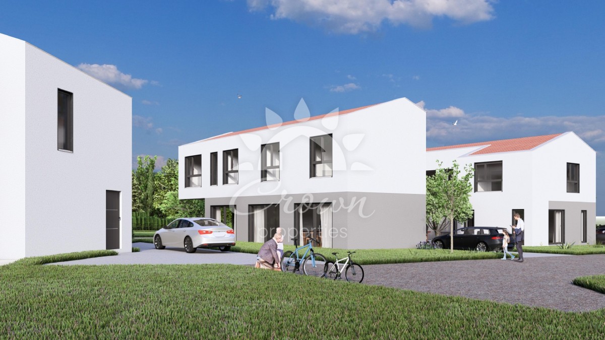Na prodaj je sodobno zasnovana hiša z bazenom, 10 km od Vrsarja, v mirnem okolju pri Svetem Lovreču. Neto bivalna površina znaša 142,9 m², zato je nepremičnina idealna za družinsko življenje, počitnice ali turistični najem. Hiša je oblikovana v modernem slogu in opremljena s toplotnimi črpalkami, ki zagotavljajo nizko porabo energije skozi vse leto.