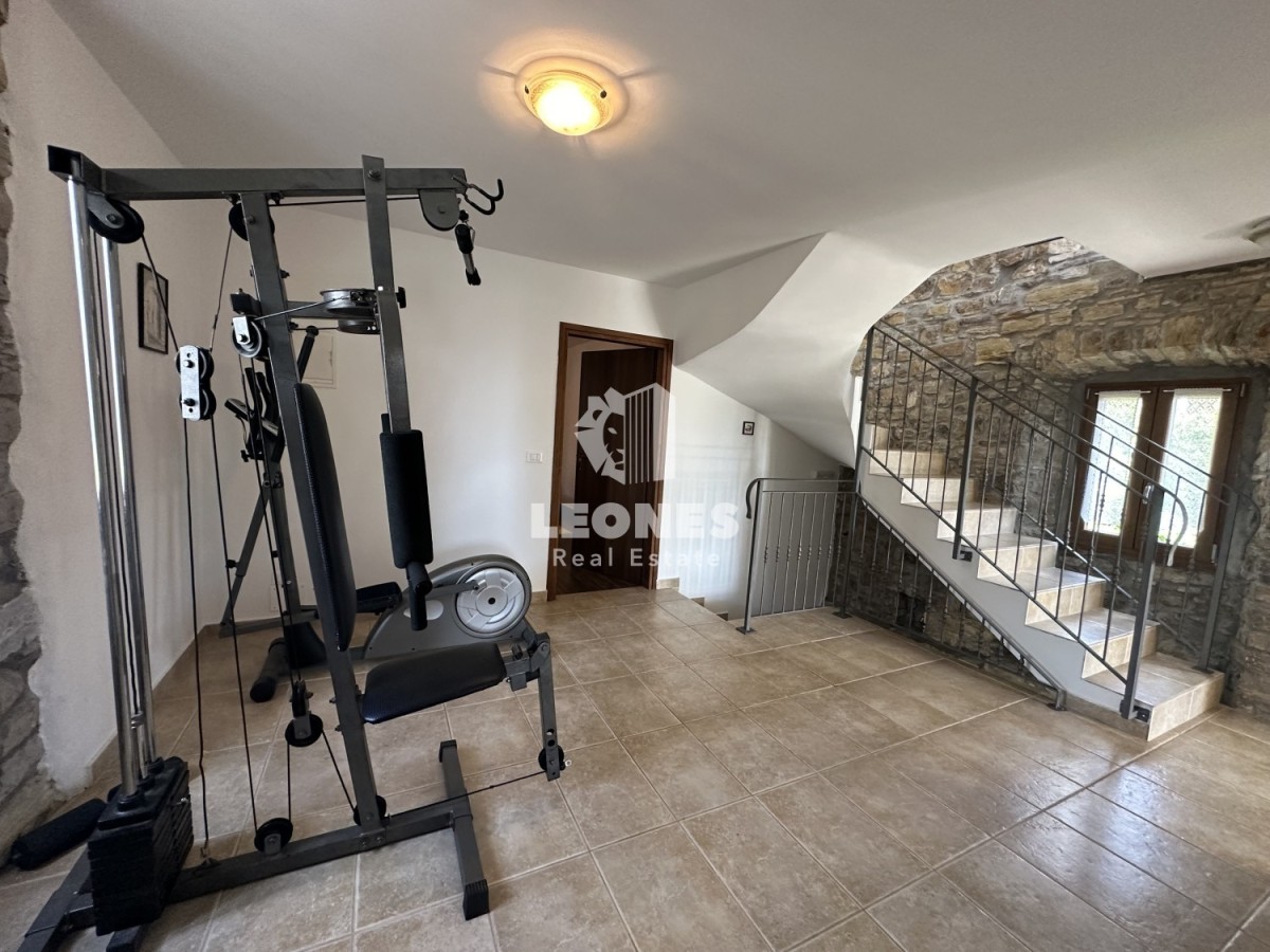 V pritličju je dnevna soba z jedilnico in kuhinja okrašena z avtohtonim istrskim kamnom.