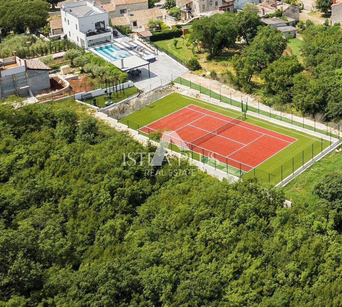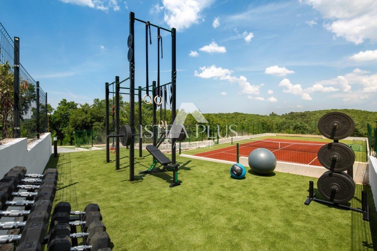 Dvorišče je v celoti ograjeno in urejeno. Zunanji prostor se ponaša z zasebnim teniškim igriščem - multifunkcionalnim igriščem, zunanjim fitnesom, jacuzzijem, ogrevanim bazenom (43,80m2) s teraso za sončenje, letno zunanjo kuhinjo, urejenim dvoriščem v sredozemskem okolju.