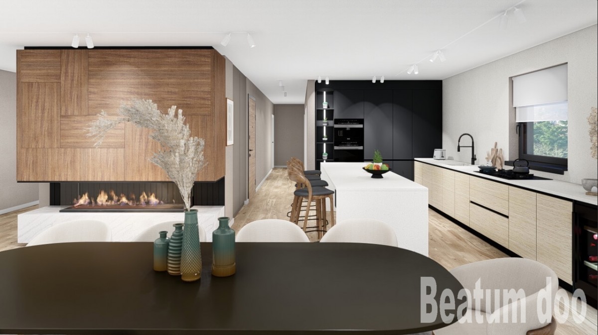 Stanovanje obsega veliko dnevno sobo s kaminom na drva, kuhinjo, jedilnico, shrambo, 5 spalnic, 5 kopalnic in veliko teraso.