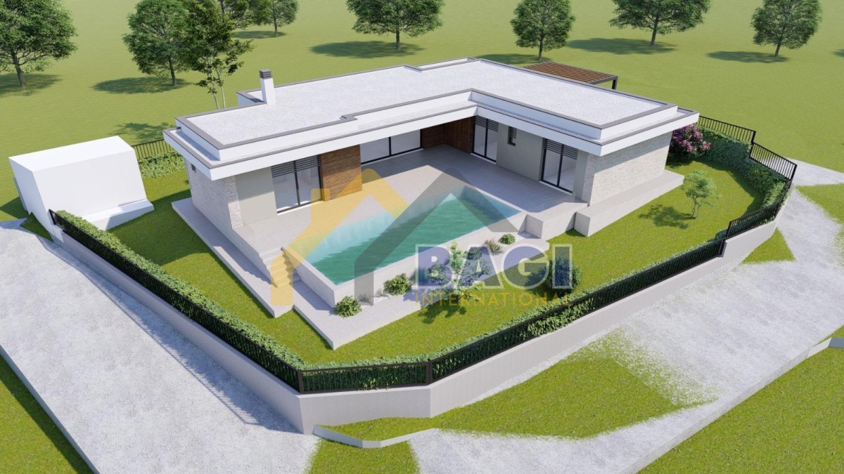 Za zemljišče je izdano veljavno gradbeno dovoljenje do junija 2027, pri čemer je potrebno začetek gradnje prijaviti najkasneje do 12. junija 2027. Projekt predvideva gradnjo moderne enonadstropne hiše neto površine 145 m², ki vključuje tri spalnice, tri kopalnice, dodatni WC za goste, vhodni prostor ter velik odprt dnevni prostor s kuhinjo in jedilnico. Iz dnevnega prostora je predviden izhod na teraso in urejeno dvorišče z bazenom, načrtovan pa je tudi pomožni objekt.