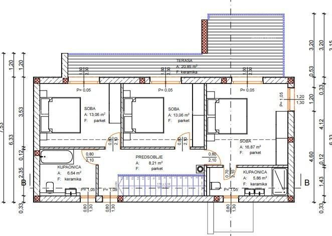 Prvo nadstropje vključuje predsobo, tri spalnice, dve kopalnici in veliko teraso, na katero imajo dostop vse spalnice. Hiša ima bazen in parkirna mesta na parceli.