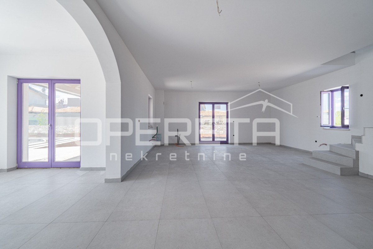 Hiša ima skupno površino 215 m², razporejeno na dveh nadstropjih, ter zunanjo poletno kuhinjo velikosti 50 m².