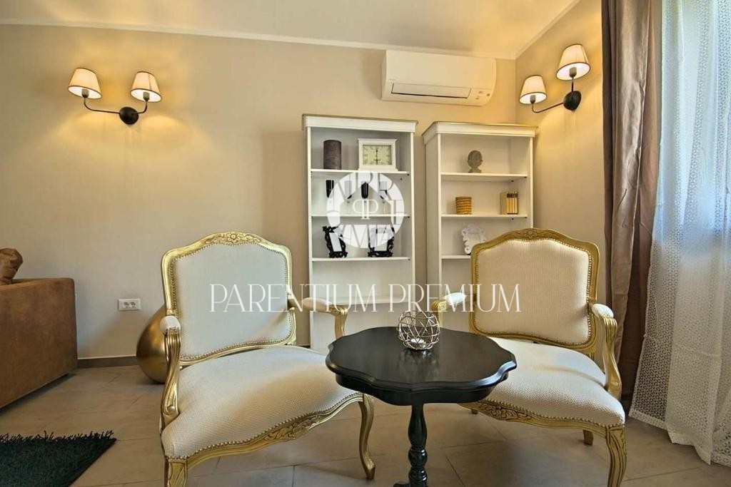 Hiša 160 m2 na parceli 818 m2, ki se razteza v dveh etažah. Pritličje je sestavljeno iz prostorne dnevne sobe s kuhinjo in jedilnico z neposrednim izhodom na teraso, ki vodi na vrt z bazenom in jacuzzijem.
