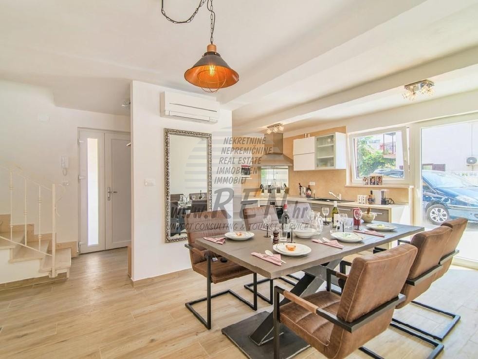 Hiša v Novigradu ima skupaj 241.44 m2 (streha terasa 88,90 m2), ki se nahaja 5 min. (200 m) od morja in lepih plaž, 5 min. (200m) oddaljeni ste od centra Novigrada. Hiša je sestavljena iz pritličja in prveg nadstropja (velika terasa na strehi). V pritličju so: dnevna soba, kuhinja, shramba, kopalnica in terasa 16,68 m2. V prvem nadstropju pa so 3 spalnice, 3 kopalnice in 2 terase skupne površine 21,9 m2. Zemljišča je 560 m2. Kompletno opremljena, klima, kamin, parkirišče, bazen.