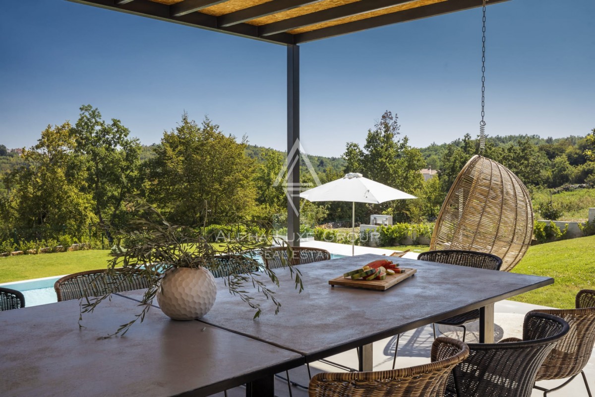 Umeščena v mirno podeželje območja Buje, ta izjemna sodobna vila združuje prefinjeno eleganco, popolno zasebnost in vrhunsko udobje. Leži na čudovito urejenem posestvu, večjem od 5.000 m², ter predstavlja idealen izbor za tiste, ki iščejo luksuzen družinski dom ali varno naložbo na istrskem trgu nepremičnin.