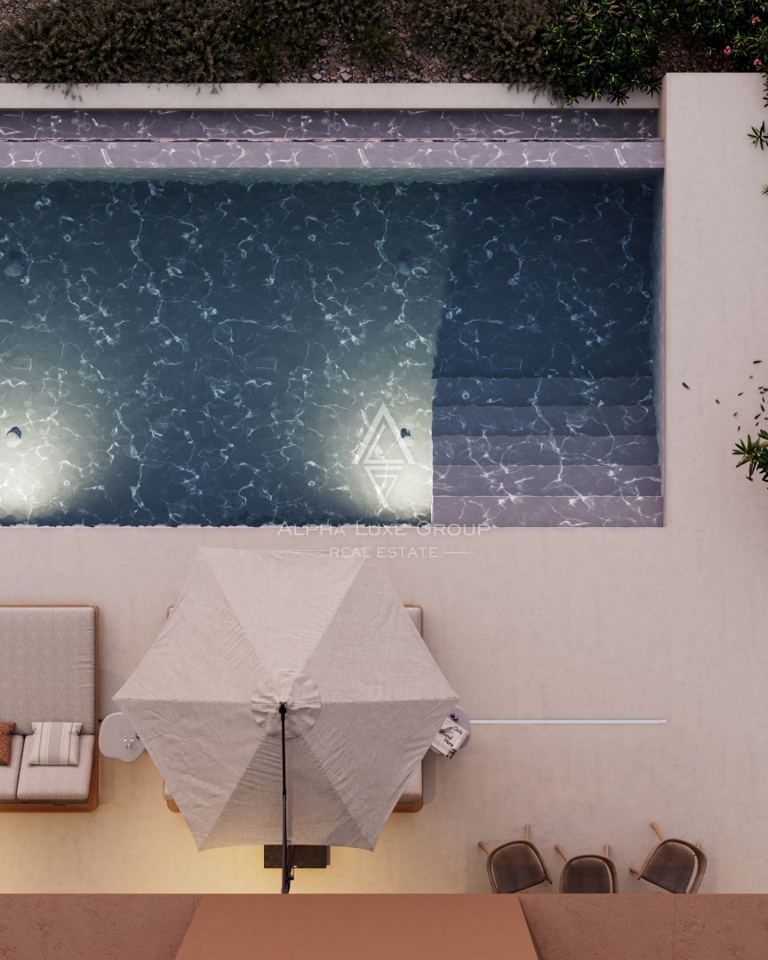 Zunanje bivanje predstavlja pomemben element te nepremičnine. Urejena okolica vključuje ogrevan infinity bazen dimenzij približno 9 m × 3,5 m, ki ustvarja spektakularno vizualno povezavo z morjem in naravno pokrajino. Arhitekturna zasnova omogoča tekoč prehod med notranjimi in zunanjimi prostori ter ustvarja idealno okolje za sprostitev, druženje in uživanje v mediteranskem podnebju.