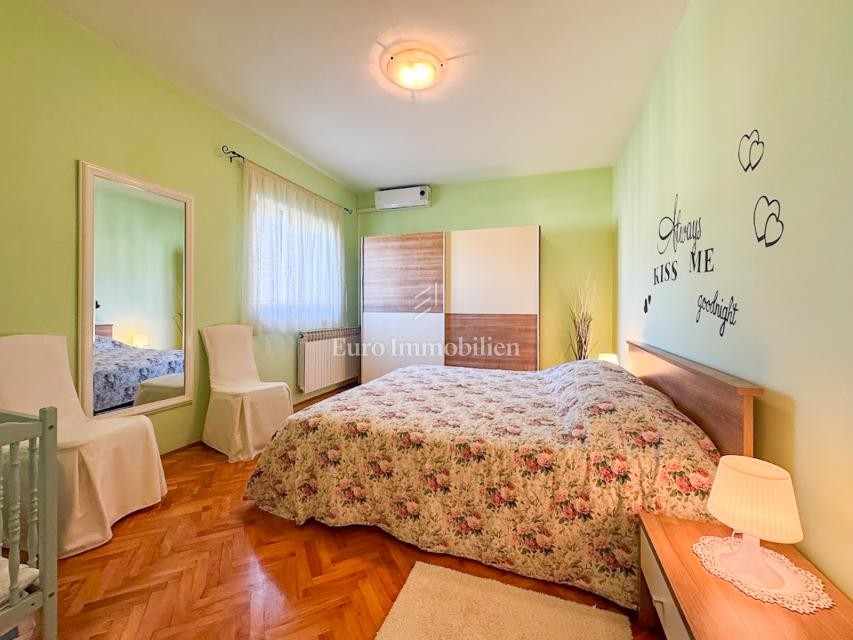 V prvem nadstropju hiše je drugo stanovanje, ki obsega kuhinjo z jedilnico in dnevno sobo, tri spalnice, kopalnico in pokrito teraso.