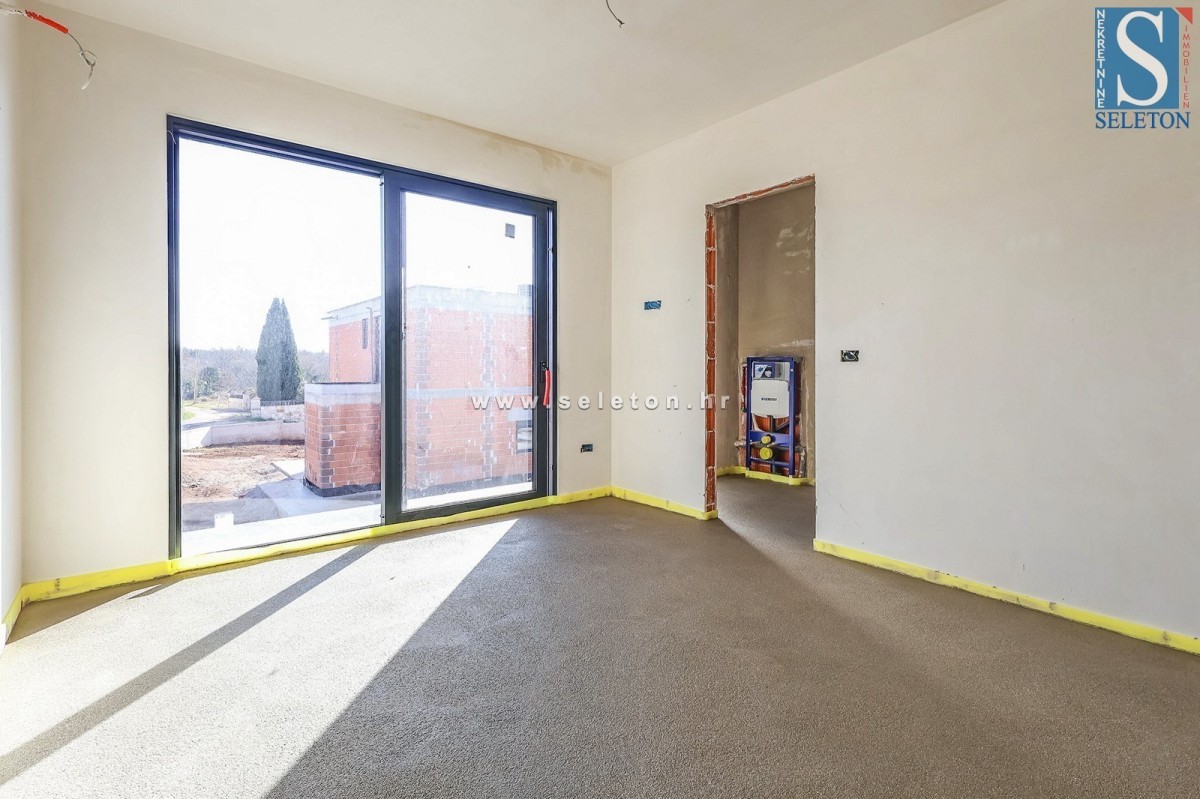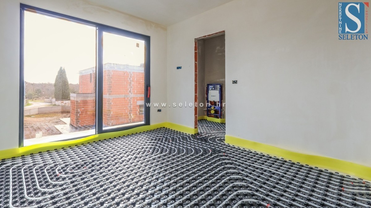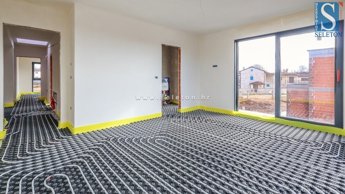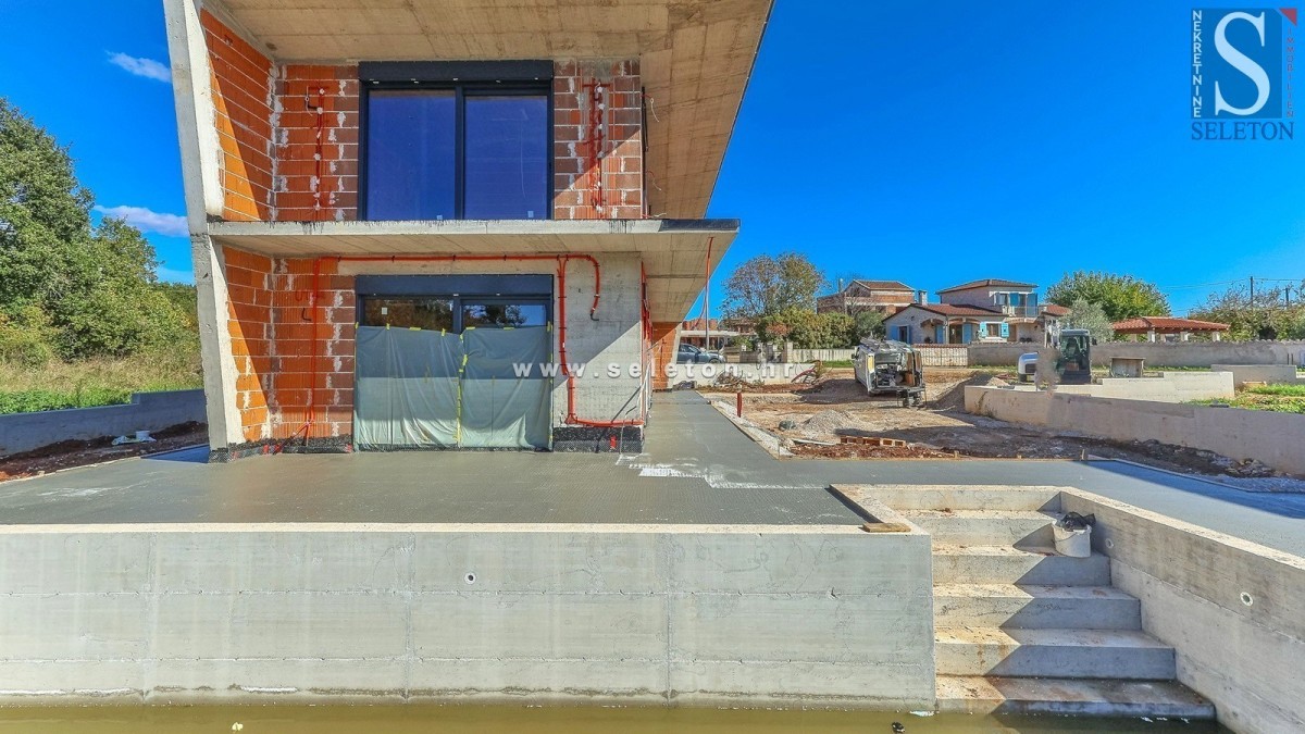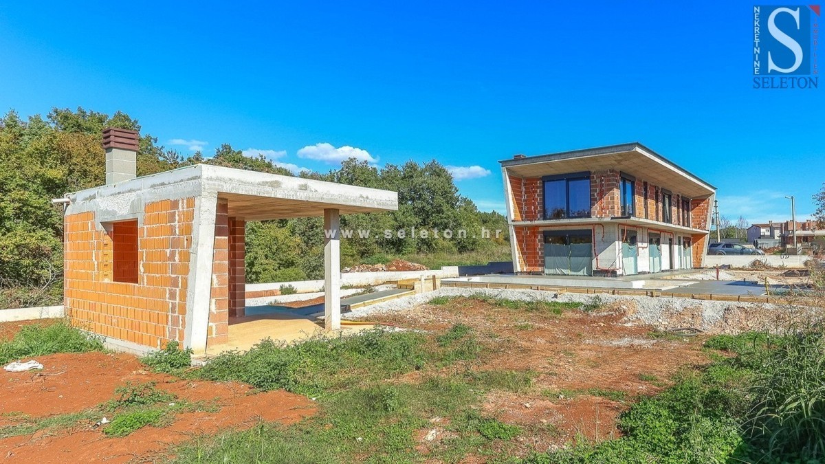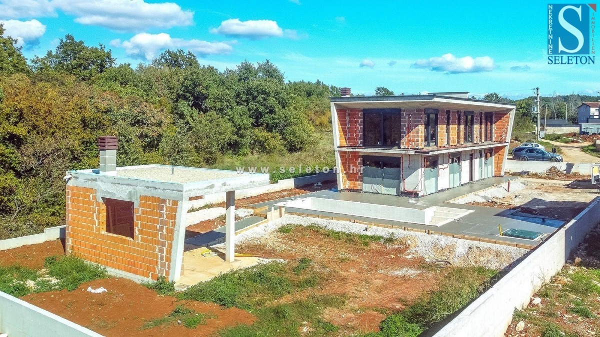 Prodamo samostojno hišo s skupno površino 243 m², sestavljeno iz dnevne sobe, kuhinje, jedilnice, terase, delovne/tehnične sobe, WC-a za goste in spalnice s kopalnico v pritličju hiše, ter hodnik, tri spalnice s kopalnico in balkon v prvem nadstropju hiše. Hiša bo imela 36 m² velik bazen, 24 m² letno kuhinjo in 5 m² shrambo ob bazenu, talno ogrevanje, klimatsko napravo v vseh spalnicah in dnevni sobi, alarm, avtomatsko zalivanje vrta, video nadzor in 3 parkirna mesta. Hiša je zgrajena na zemljišču velikosti 1.080 m², nahaja se v naselju cca 12 km od morja/plaže in cca 11 km od Poreča.