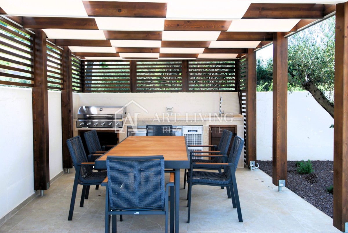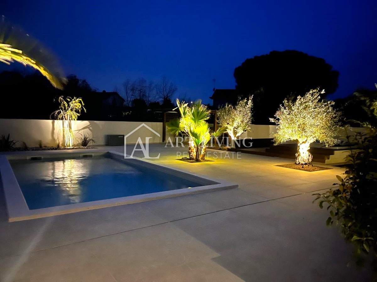 Na zemljišču velikosti 700 m2 se nahaja ogrevan bazen (32 m2) z ležalnikom, dnevni prostor s hidromasažno kadjo (jacuzzi), skrbno urejen vrt in vrt ter popolnoma pokrita in opremljena letna kuhinja, idealna za prijeten trenutke na prostem.