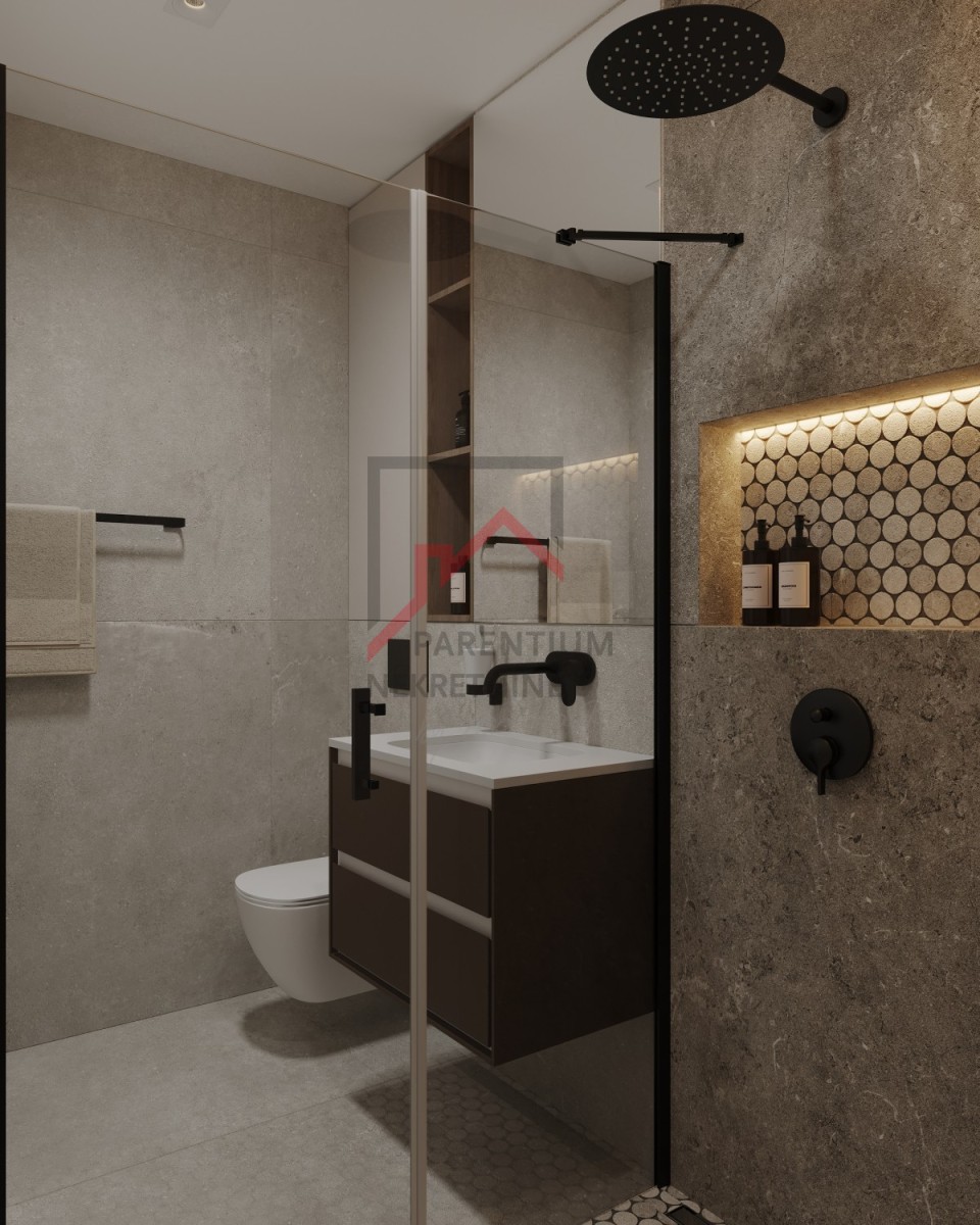 Kakovostni materiali, kot so sanitarna keramika Hans Grohe in keramične ploščice vrhunskih proizvajalcev.
