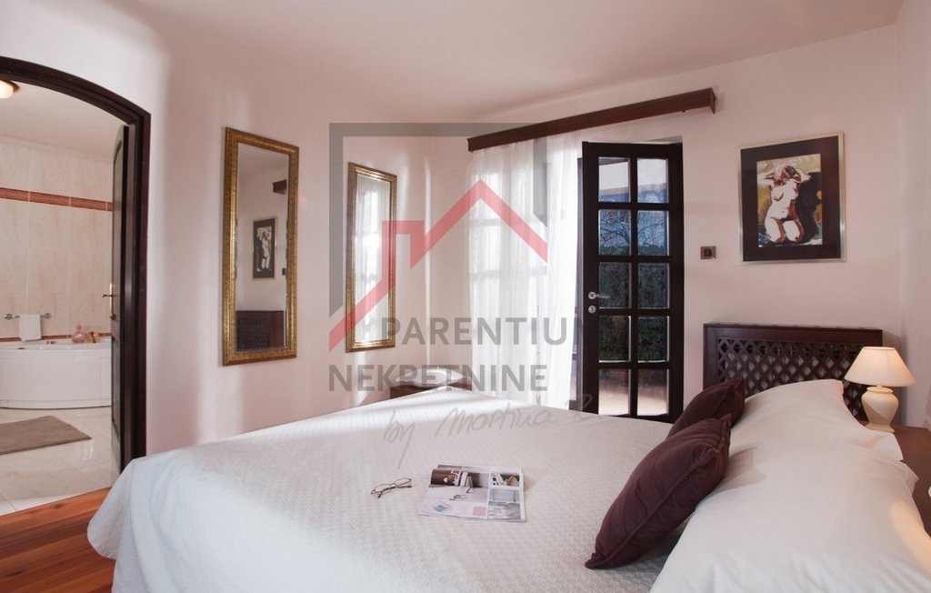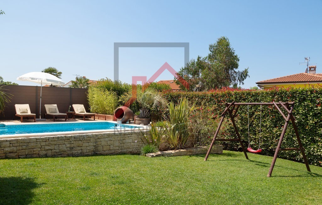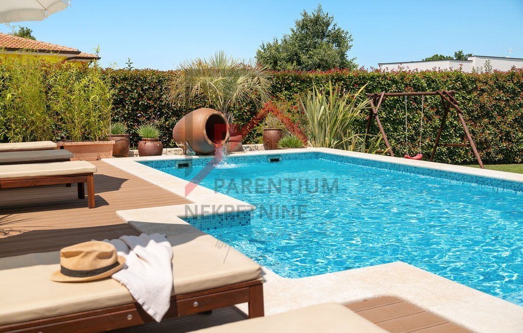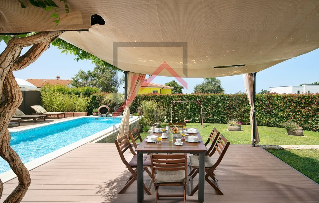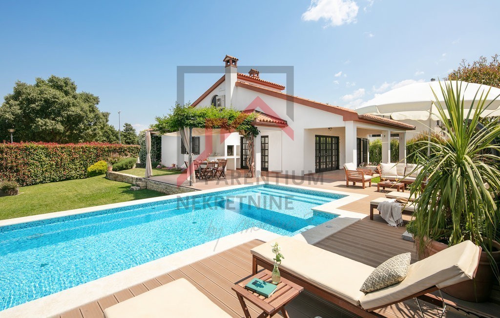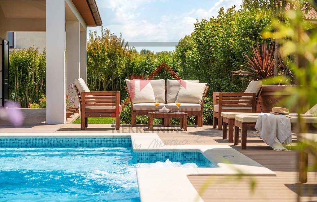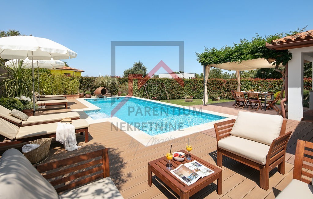To čudovito posestvo v bližini Poreča ponuja popolno mešanico razkošja, zasebnosti in udobja, ki se nahaja na 780 m² velikem zemljišču s skrbno urejenim vrtom. Uživajte v zasebnem bazenu, prostorni terasi za sončenje in letni kuhinji, medtem ko pokrita terasa, ki obkroža hišo, nudi idiličen prostor za sprostitev in druženje na prostem.