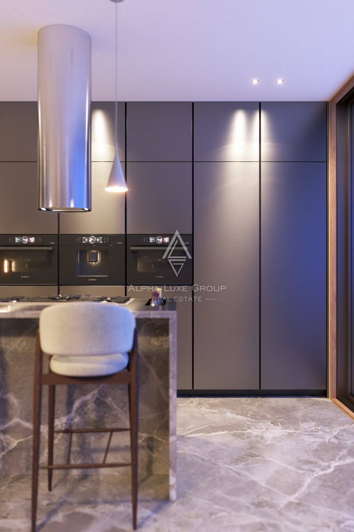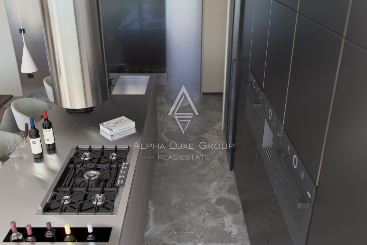 Poseben poudarek predstavlja impresivna strešna terasa velikosti približno 147,75 m2, ki ustvarja zasebno zunanjo oazo, idealno za lounge, poletno kuhinjo, sončenje ali večerna druženja z odprtimi razgledi in popolnim mirom. Vrhunski materiali in oprema vključujejo sisteme ogrevanja in hlajenja Mitsubishi, prestižno italijansko keramiko in sanitarno opremo, lesen parket v spalnicah ter keramiko velikega formata v drugih prostorih. Kuhinja Arrex Cucine je opremljena z aparati Bosch in Neff, dnevni prostor z dizajnerskimi sedežnimi garniturami Ditre, spalnice pa z izbranim pohištvom San Giacomo.